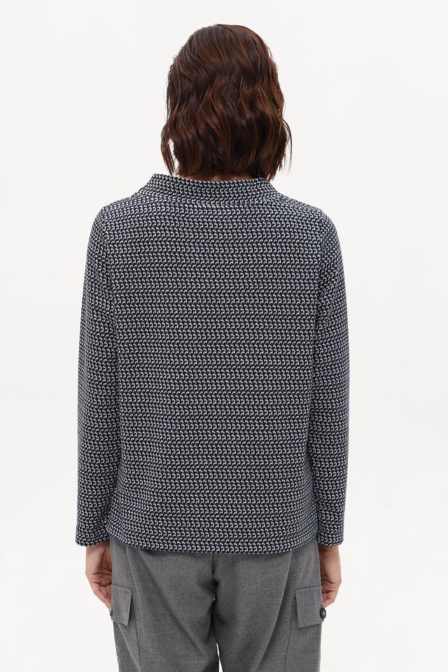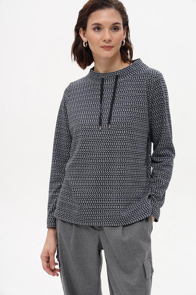 Пуловер имеет прямой крой и длинные рукава. Особенностью модели является оригинальный принт, который придает ей индивидуальность. Небольшой вырез горловины дополнен двумя шнурками, добавляющими образу динамичности.