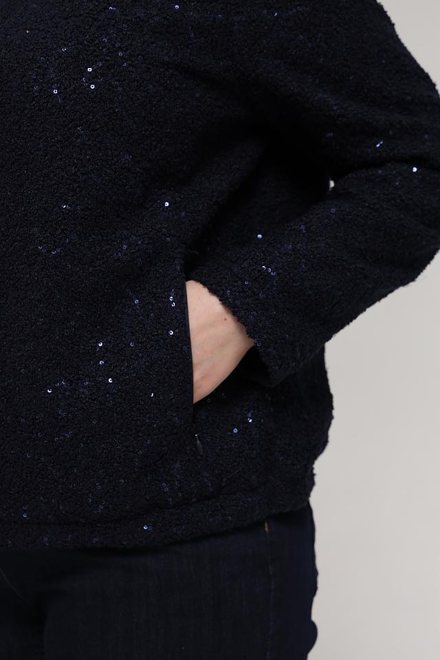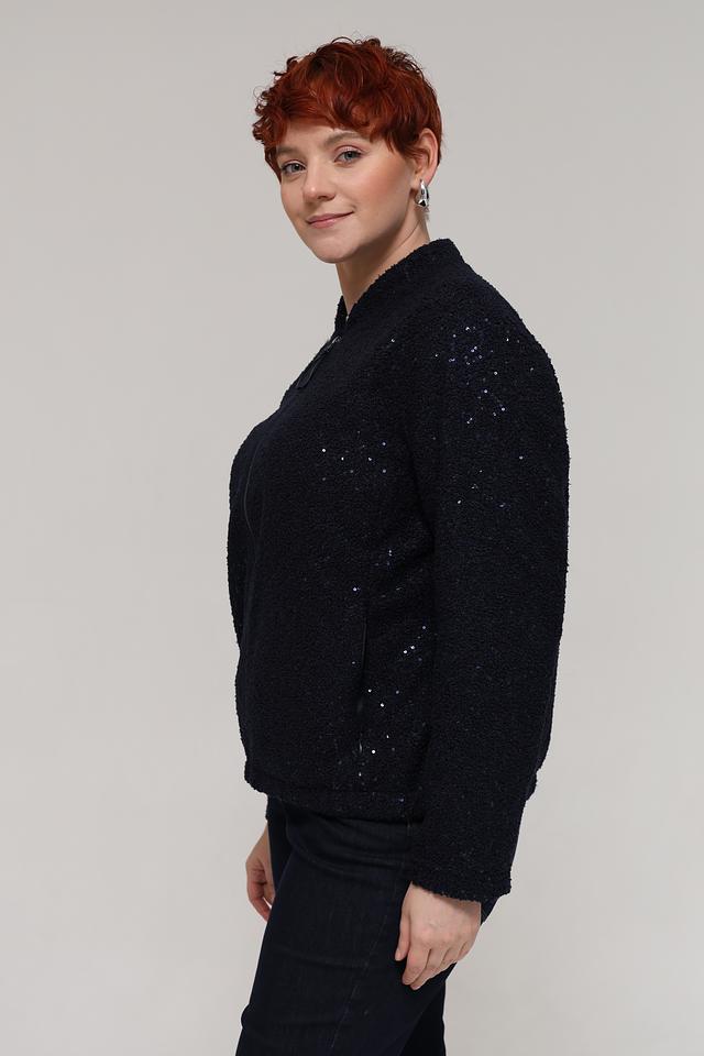 Жакет имеет чёрный цвет с деликатным блеском, который придаёт изделию особый шарм. Текстура ткани напоминает букле, что делает жакет интересным и необычным.