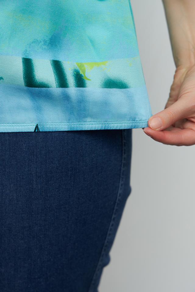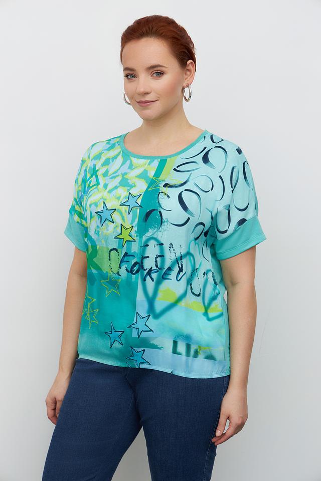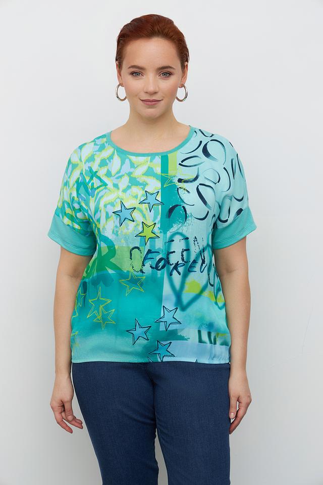 Эта стильная блуза от Rabe collection выполнена в приятной бирюзовой гамме и украшена ярким принтом, включающим звезды и абстрактные элементы.
