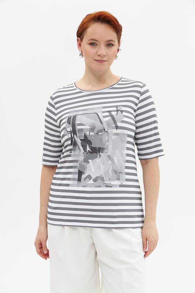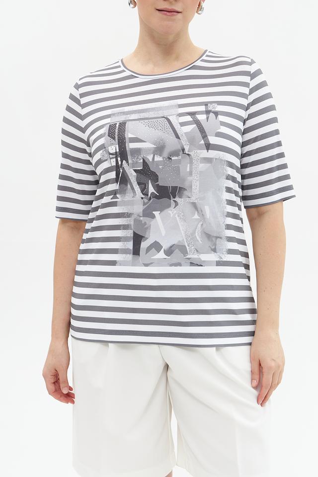 Женская футболка Rabe collection серого цвета с горизонтальной полоской и графичным принтом. Изготовлена из мягкой вискозы с добавлением эластана для комфорта и свободы движений. Идеальный выбор для создания стильного повседневного образа. Состав: вискоза 96%, эластан 4%