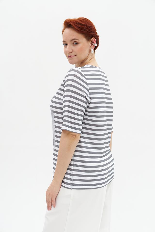 Женская футболка от бренда Rabe collection выполнена в серо-белую полоску. Модель имеет прямой, слегка свободный крой, который обеспечивает комфортную посадку по фигуре.