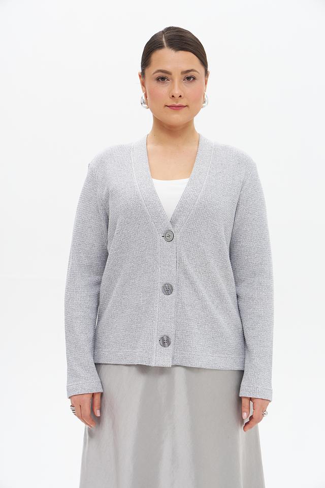 Этот жакет от Rabe collection станет отличным дополнением к вашему гардеробу. Модель выполнена в сером цвете и имеет классический крой кардигана с V-образным вырезом.