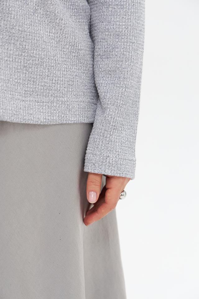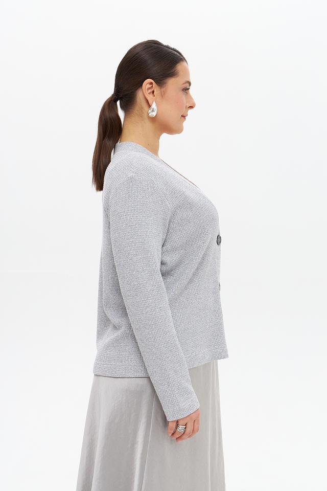 Жакет застегивается на четыре пуговицы, что позволяет регулировать степень прилегания. Длинные рукава делают его подходящим для прохладной погоды. Текстура ткани – мелкая вязка, придающая изделию аккуратный и элегантный вид.