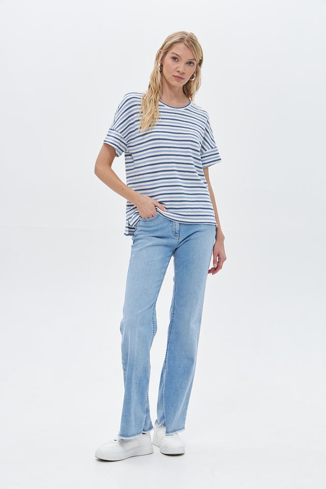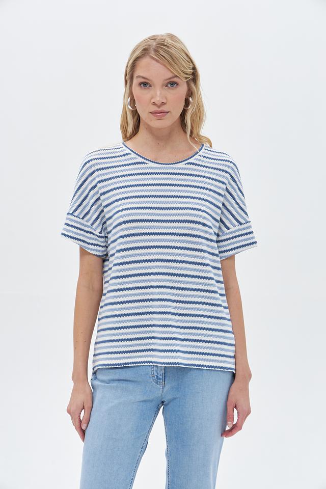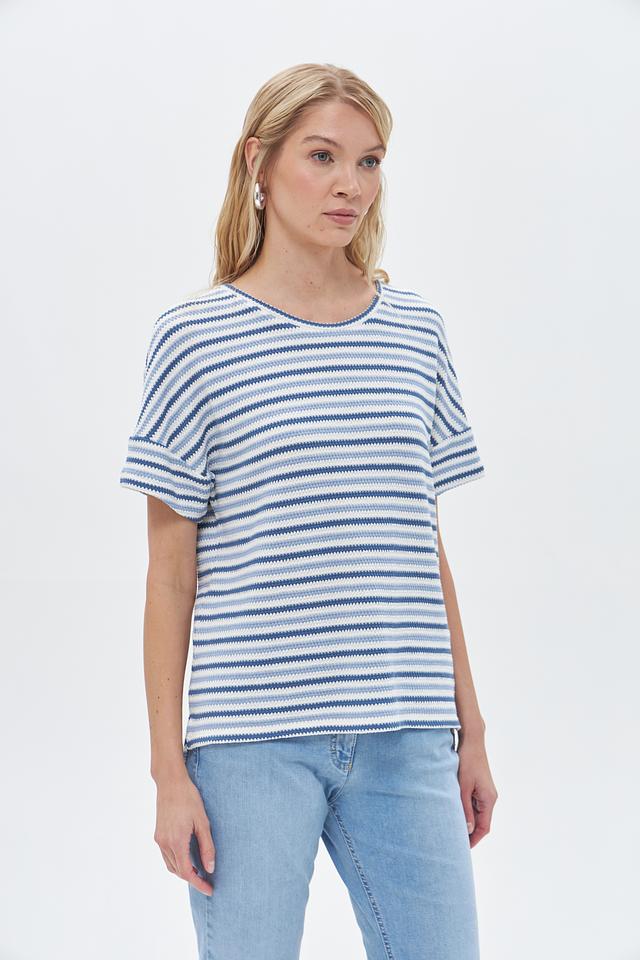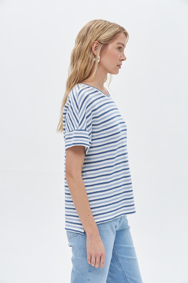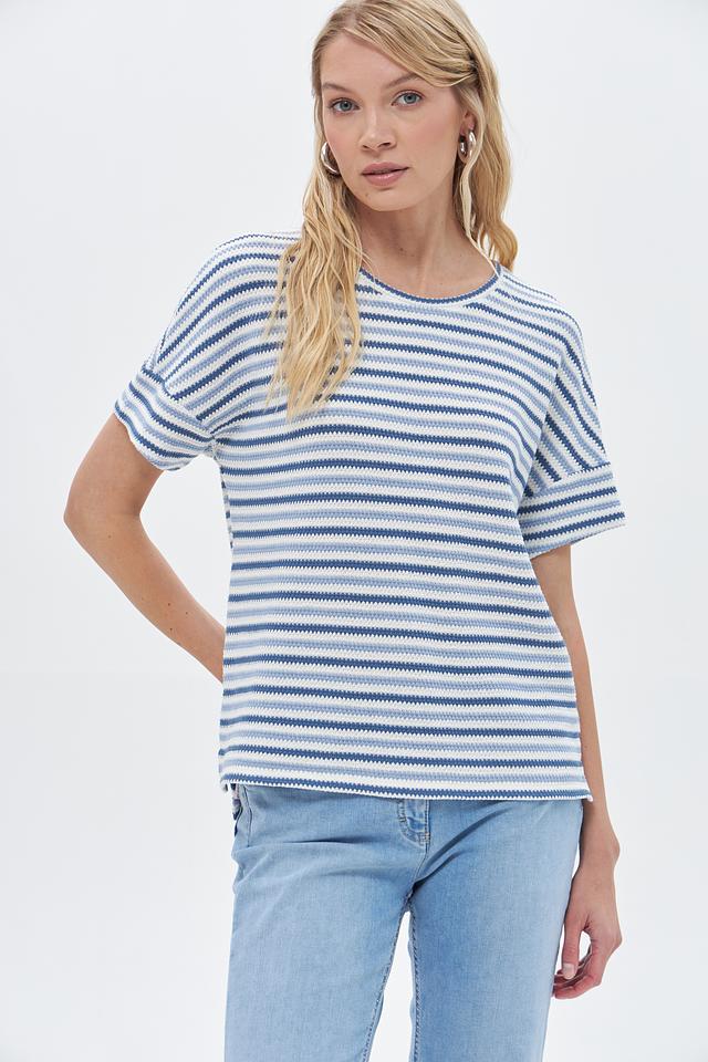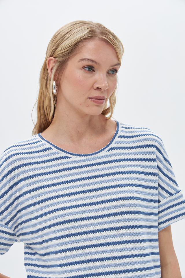 Основной цвет пуловера – синий, дополненный белыми полосами, создающими яркий и динамичный узор. Модель выполнена из высококачественного трикотажа, в состав которого входит 49% хлопок, 32% полиэстер, 18% вискоза и 1% эластан.