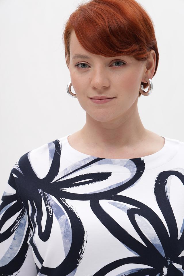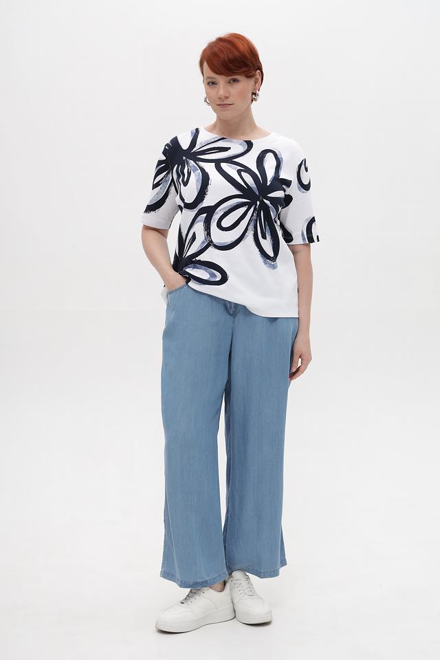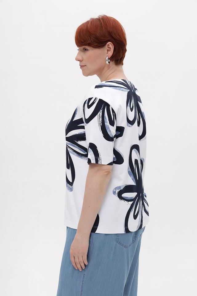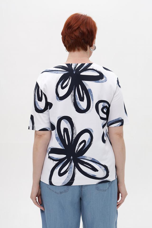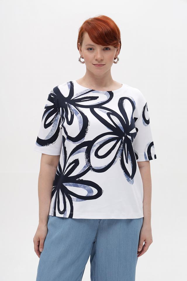 Эта футболка от Rabe collection – идеальный выбор для создания непринужденного и элегантного образа. Футболка выполнена в белом цвете и украшена крупным, выразительным цветочным принтом в сине-черной гамме.