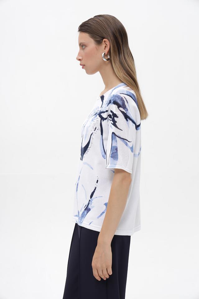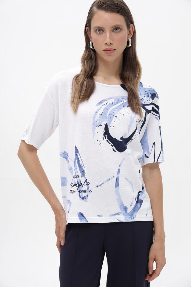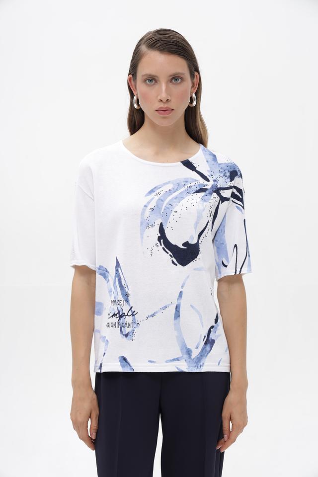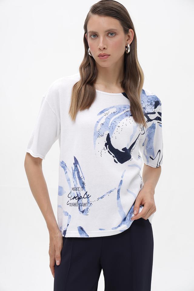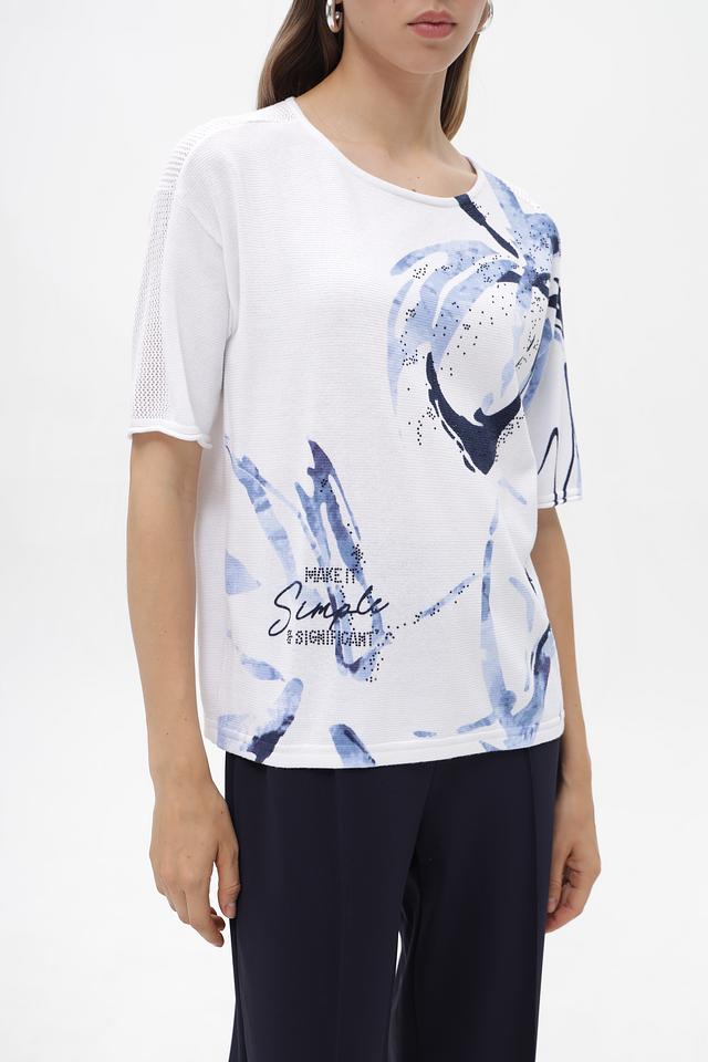 Представляем стильную футболку от бренда Rabe collection. Эта модель выполнена в белом цвете и украшена эффектным принтом в синих оттенках, добавляющим образу оригинальности.