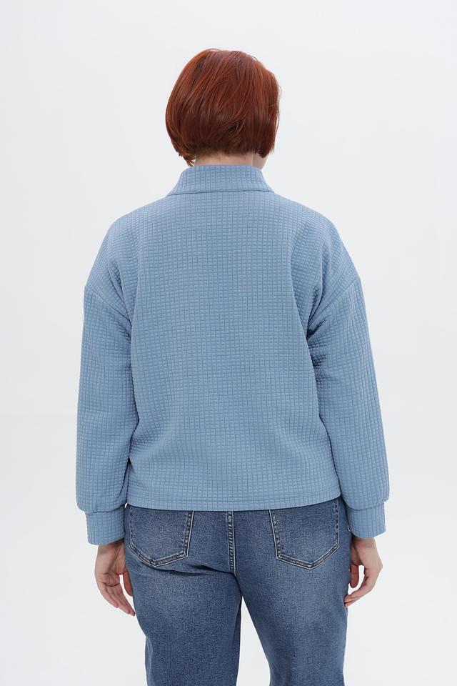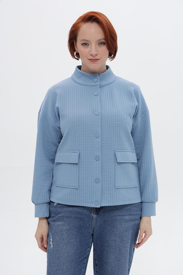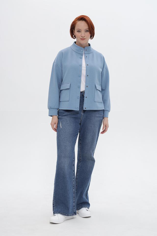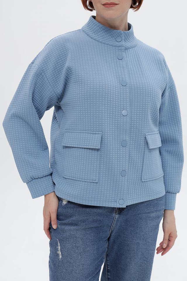 Жакет выполнен в технике стежки, что придает ему оригинальный вид и дополнительную теплоизоляцию. На передней части расположены два накладных кармана. Длинные рукава с манжетами обеспечивают комфортную посадку.