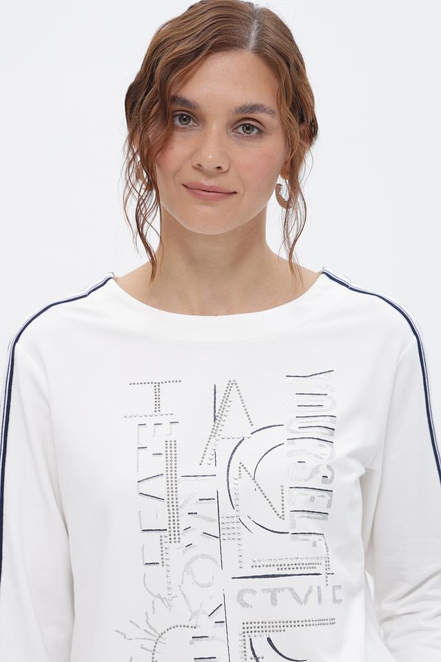 Белая футболка Rabe collection с оригинальным декором и контрастными полосками. Изготовлена из мягкого и приятного к телу сочетания хлопка, модала и эластана. Состав: хлопок 48%, модал 48%, эластан 4%