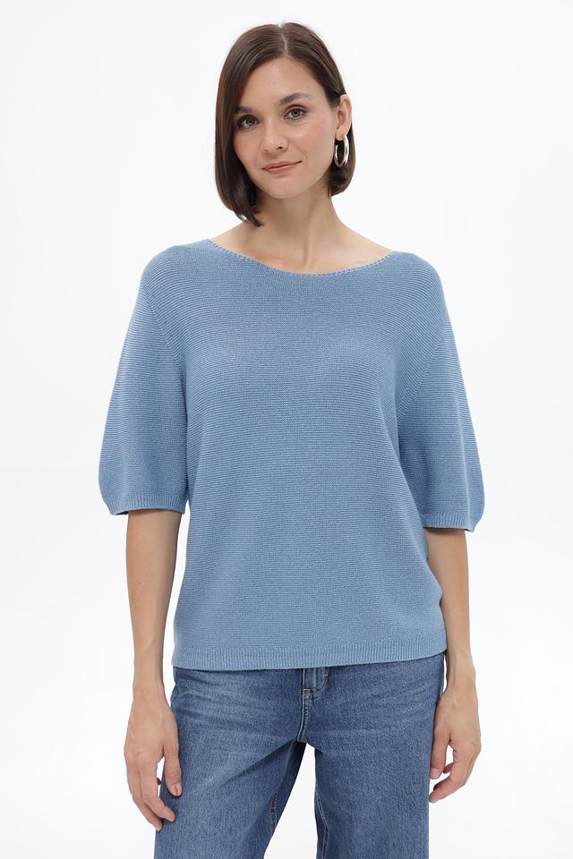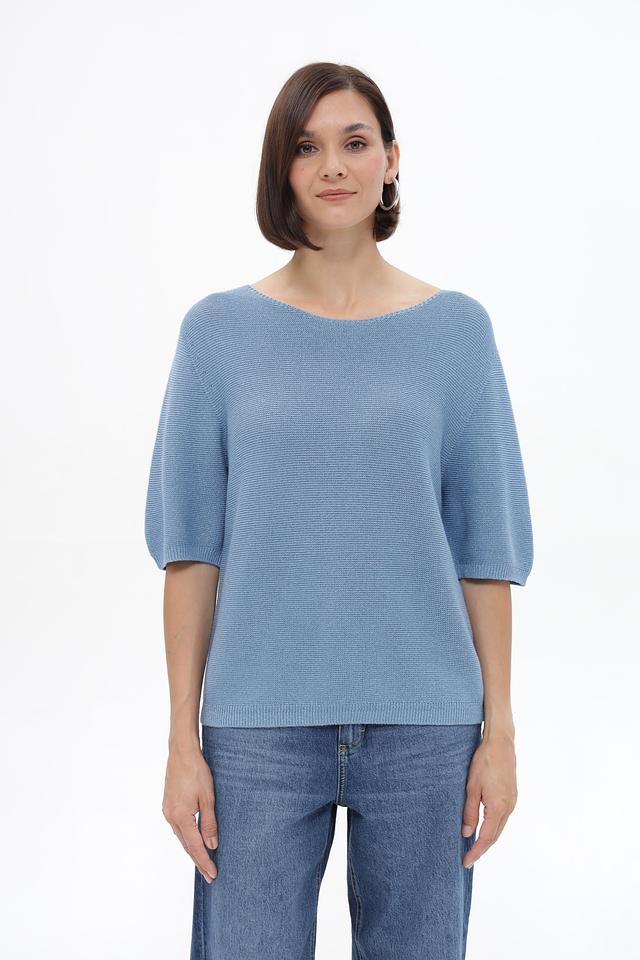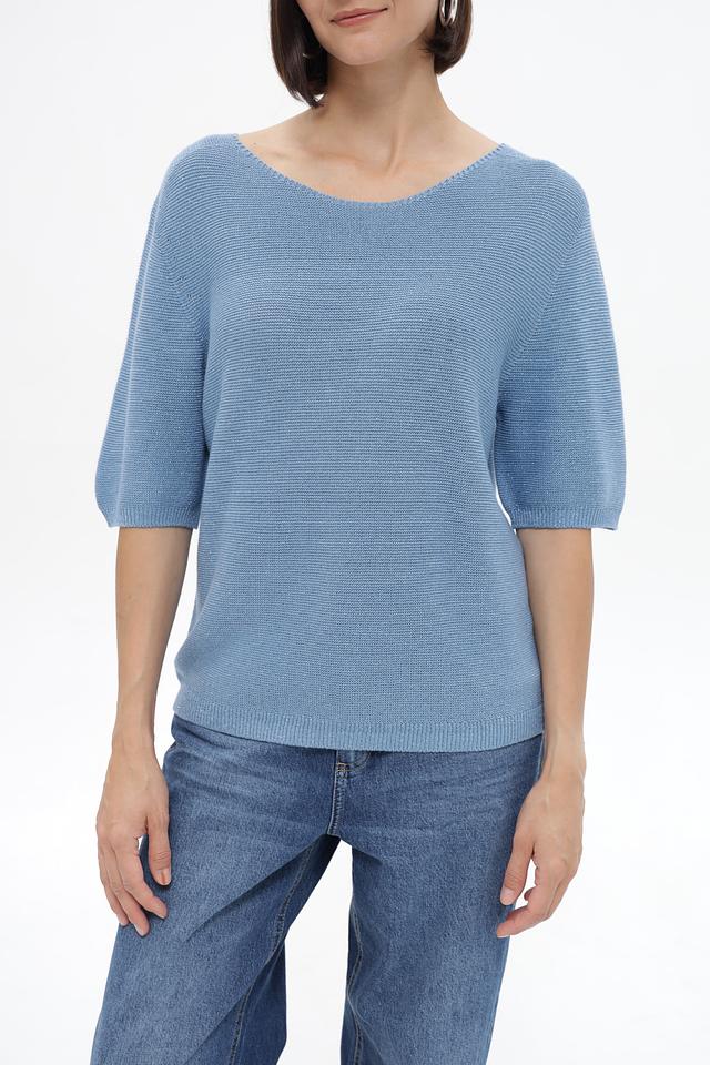 Пуловер имеет округлый вырез горловины и короткие рукава 3/4, что делает его идеальным для теплой погоды. Изготовлен из мягкого трикотажа, в состав которого входит хлопок, полиэстер и металлическая нить, что придает изделию лёгкий блеск и интересную фактуру.