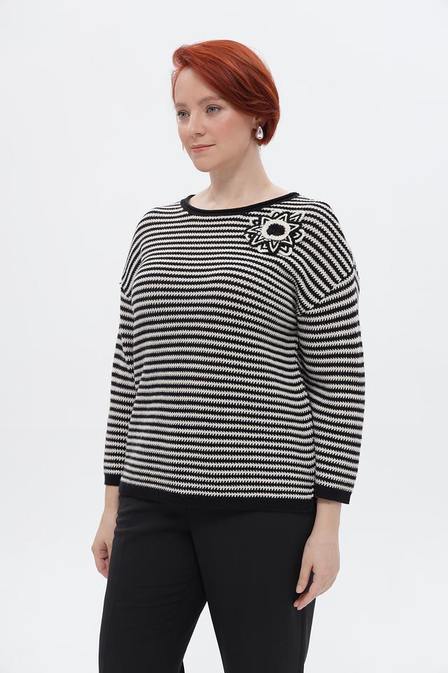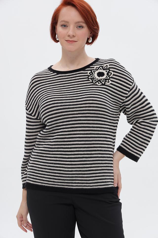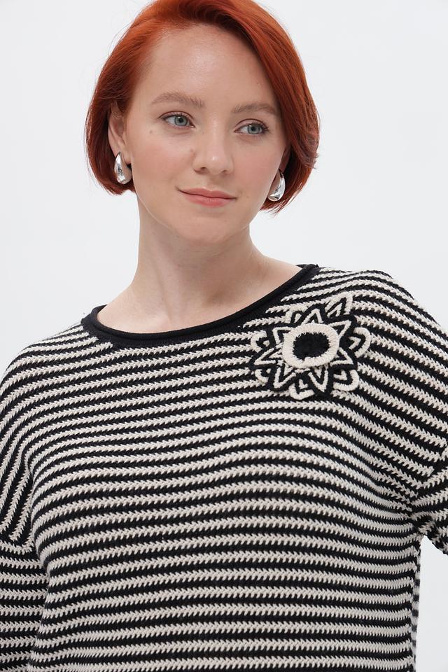 Пуловер имеет удобный круглый вырез горловины и рукава длиной 3/4. Оригинальный акцент – декоративная аппликация в виде цветка, расположенная на груди, добавляет образу женственности и индивидуальности.