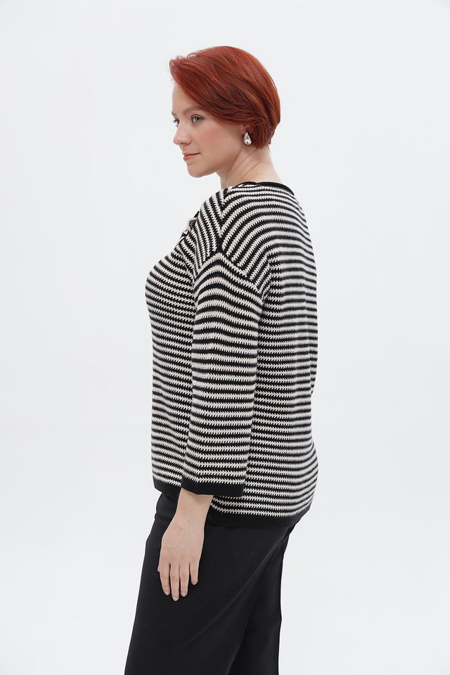 Элегантный пуловер от бренда Rabe collection станет отличным дополнением к вашему гардеробу. Модель выполнена в классическом бело-черном сочетании с вертикальным узором в полоску, визуально стройнящим силуэт.