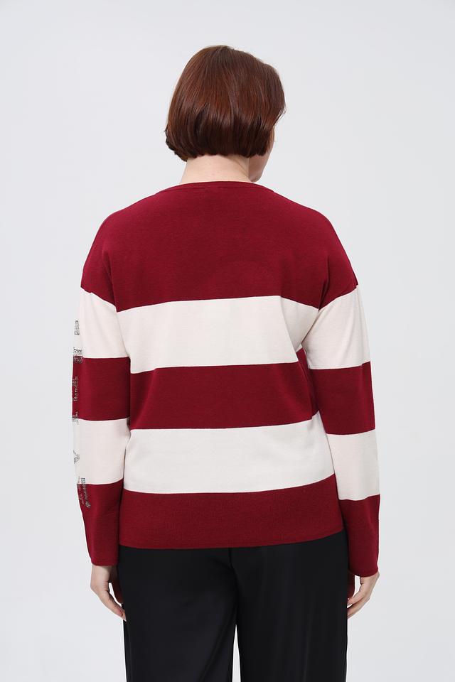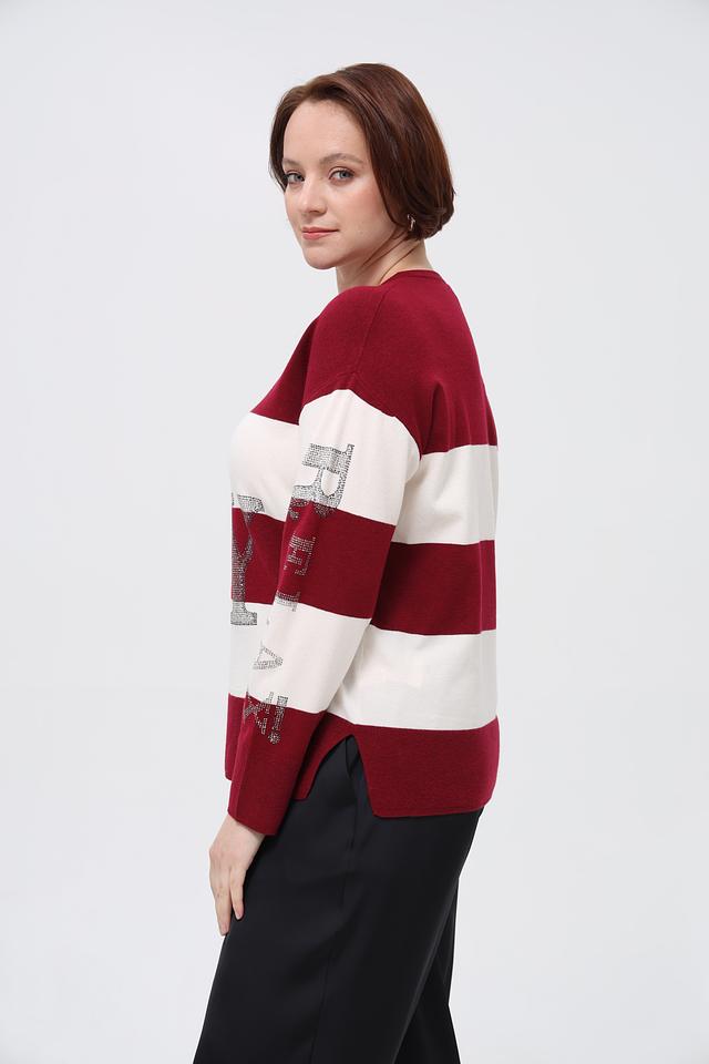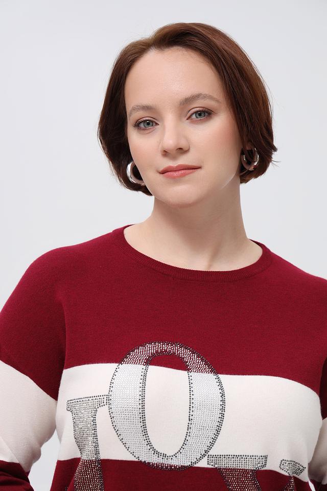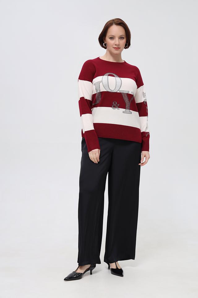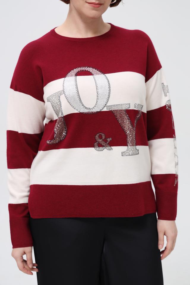 Этот пуловер от Rabe collection выполнен в бордовом цвете с белыми горизонтальными полосками. Модель украшена крупной надписью с буквами, декорированными блестками, что придает ей особый шарм.