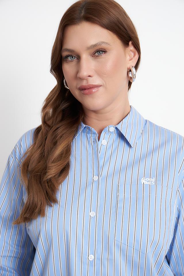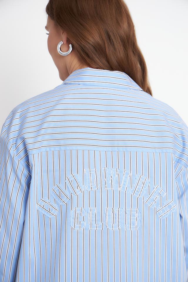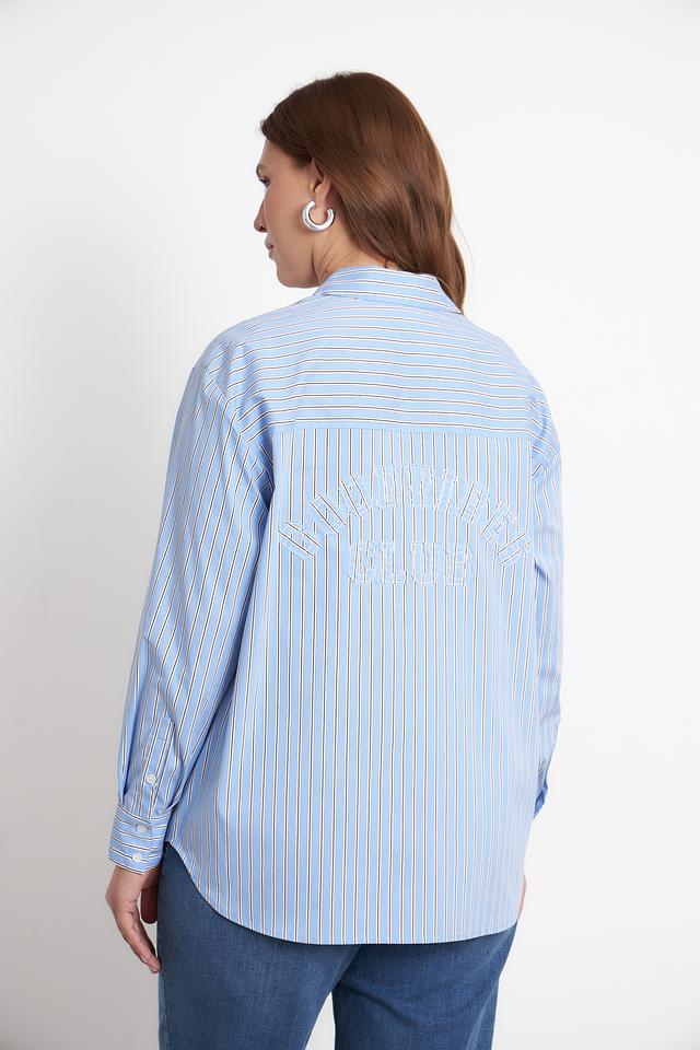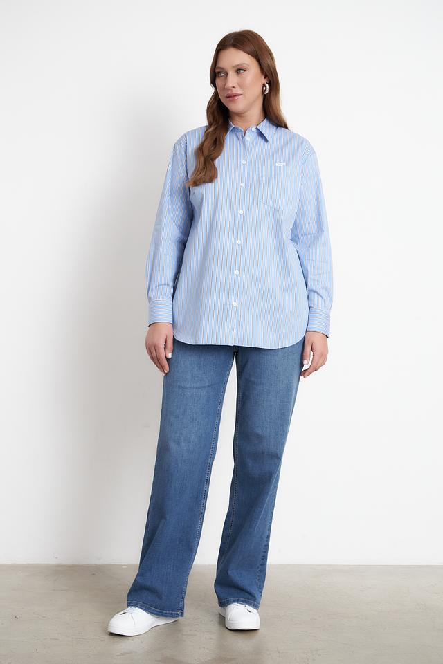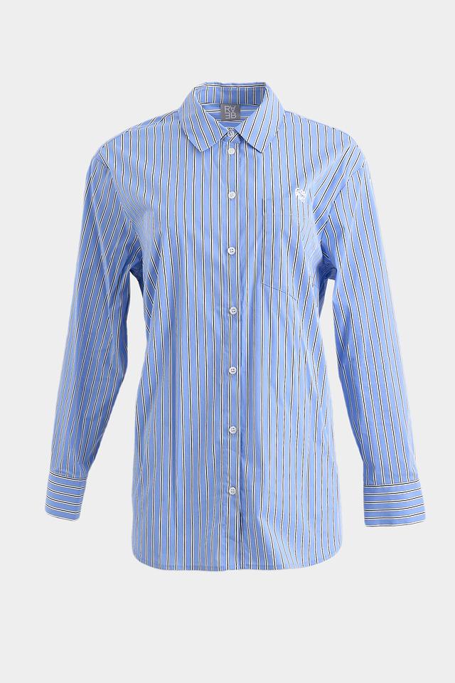 Модель имеет классический крой с длинными рукавами и отложным воротником. Застежка на пуговицах по всей длине позволяет регулировать степень прилегания. Блуза дополнена нагрудным карманом с логотипом бренда.