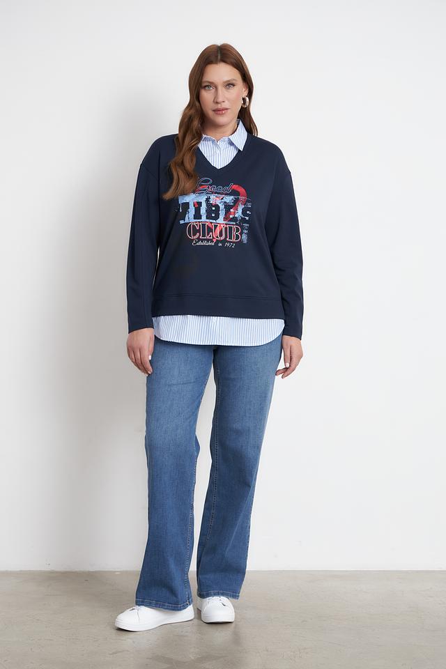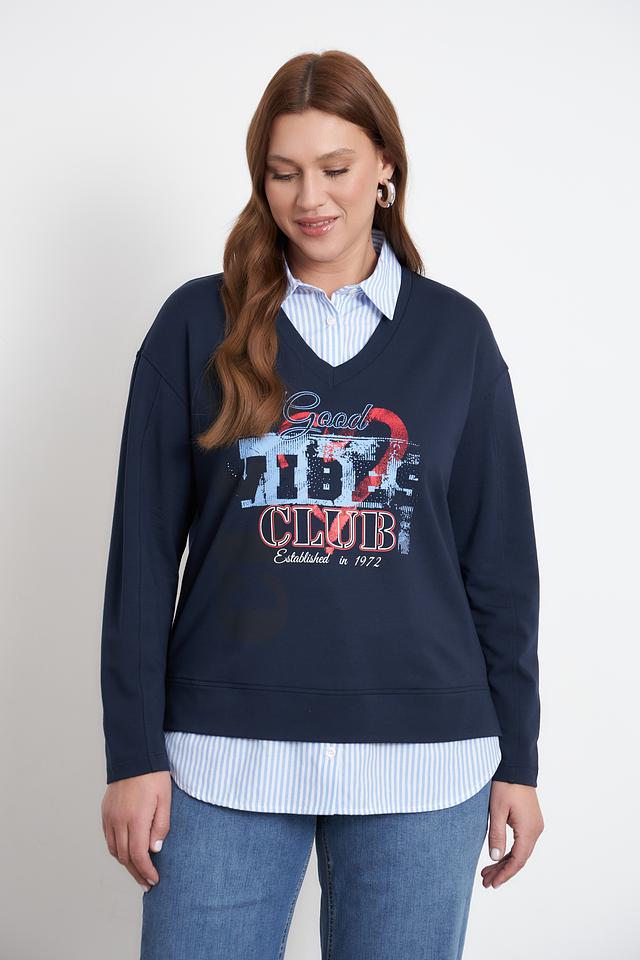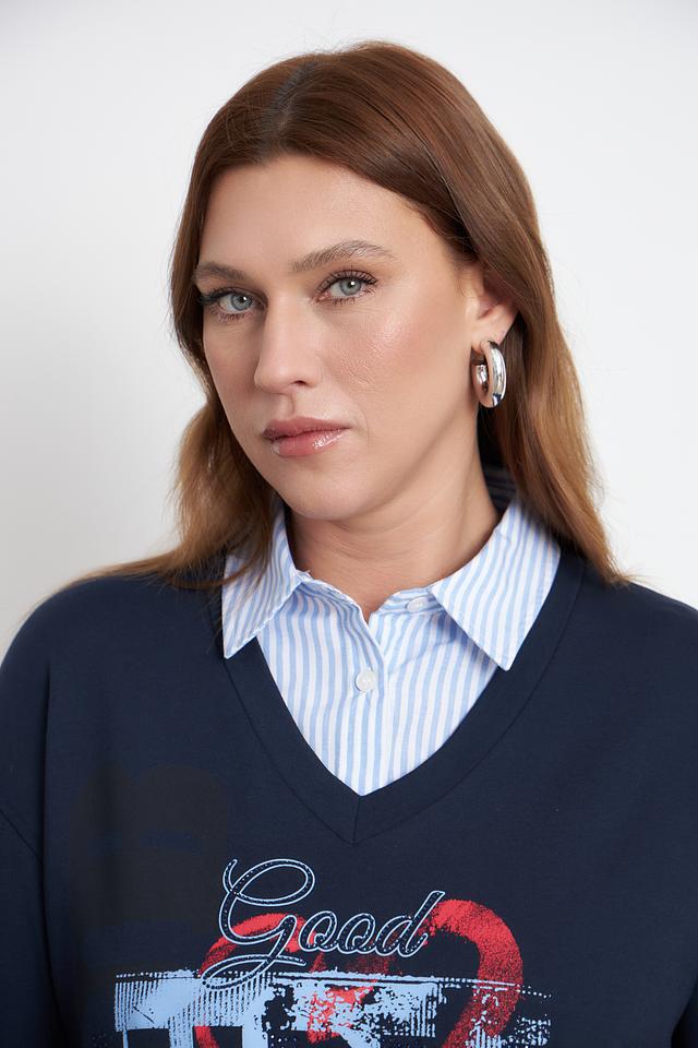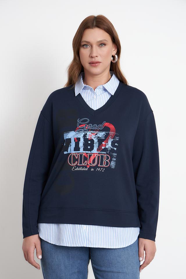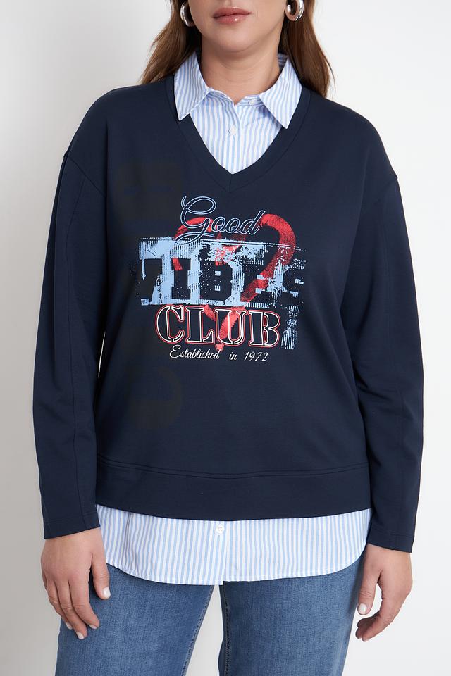 Этот стильный пуловер от Rabe collection выполнен в насыщенном синем цвете и украшен эффектным принтом "Good Vibes Club". V-образный вырез горловины и свободный крой делают его универсальным для создания различных образов.