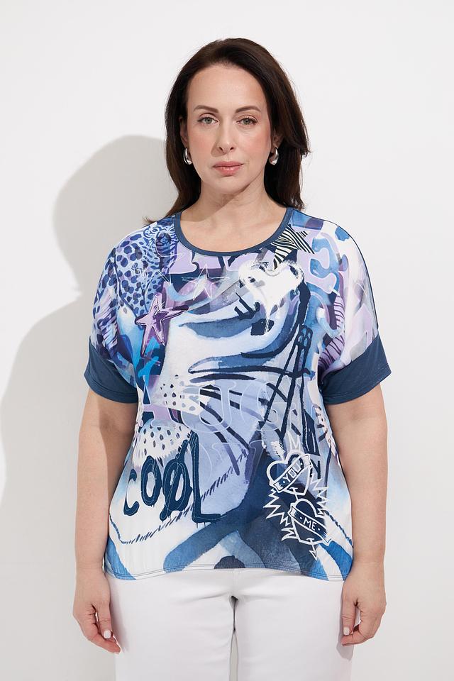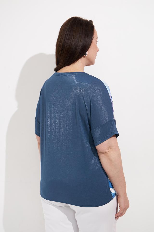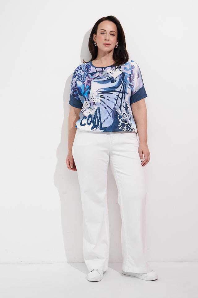 Блуза от Rabe collection синего цвета с ярким абстрактным принтом и короткими рукавами. Модель выполнена из мягкой вискозы с добавлением полиэстера и эластана, обеспечивающих комфорт и хорошую посадку. Состав: вискоза 82%, полиэстер 13%, эластан 5%