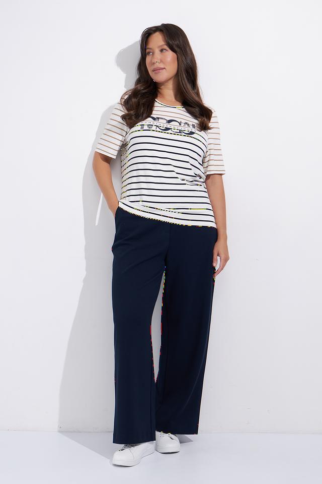 Брюки имеют широкий крой, который обеспечивает комфорт и свободу движений. Высокая посадка подчеркивает талию и создает элегантный силуэт. По бокам брюк проходит декоративная полоса, выполненная в ярких цветах, что придает им оригинальный вид.
