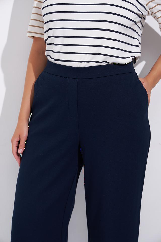 Состав ткани: 48% вискоза, 47% полиэстер, 5% эластан. Вискоза обеспечивает мягкость и приятные ощущения при носке, полиэстер – износостойкость, а эластан – эластичность и комфортную посадку. Брюки легко стираются и быстро сохнут.