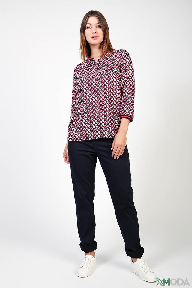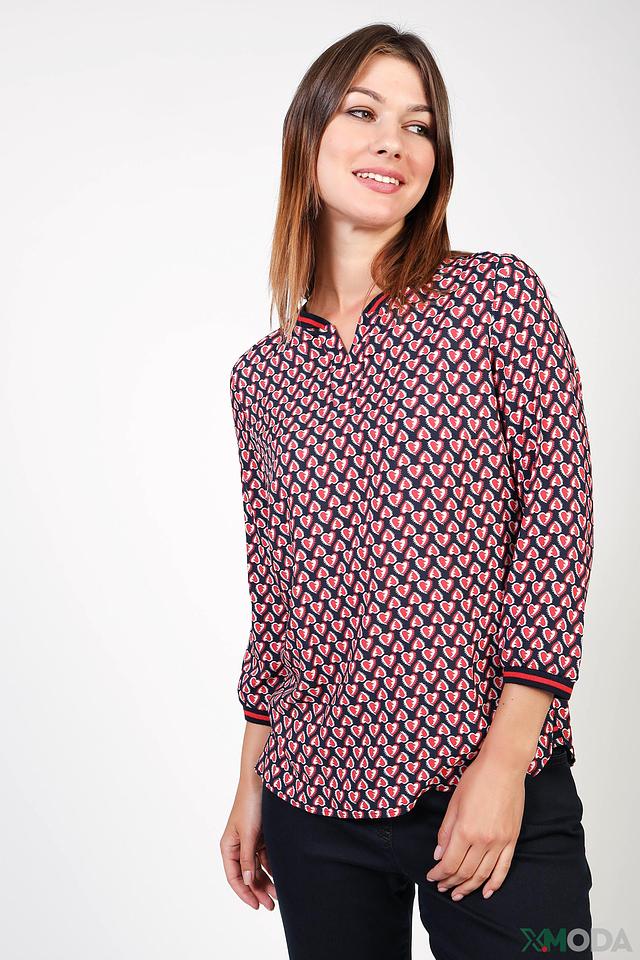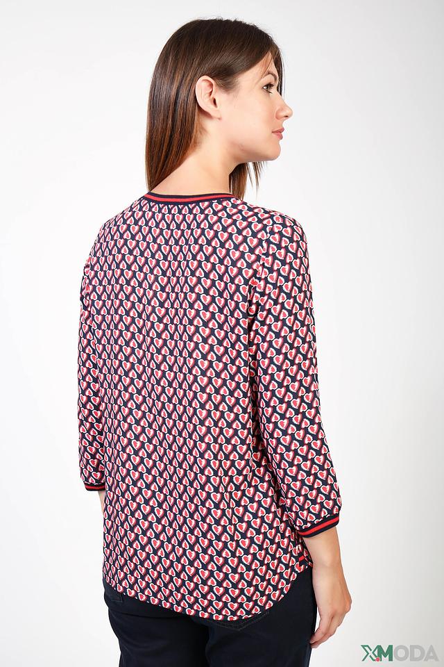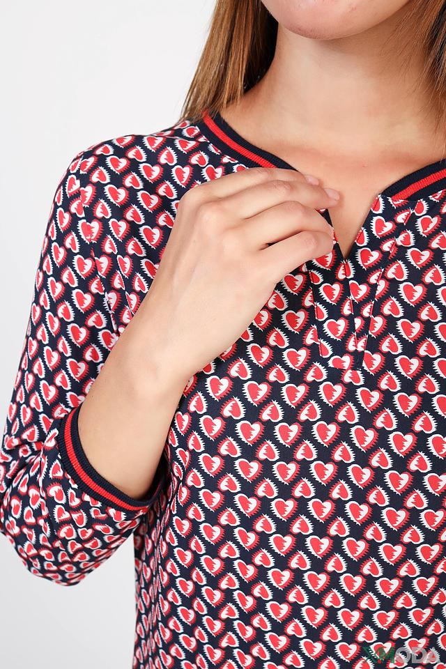Основной цвет блузы – глубокий синий, который служит идеальным фоном для принта из красных сердец. Воротник V-образный, с отделкой тонкой красной полоской. Рукава длиной три четверти также имеют красную окантовку.
