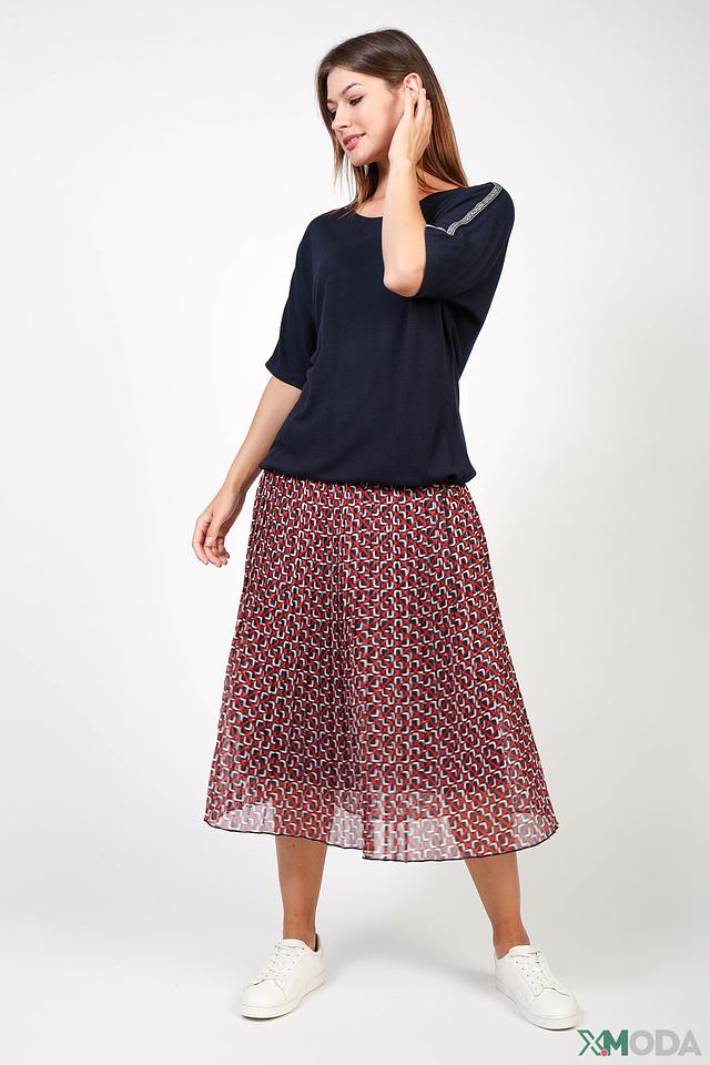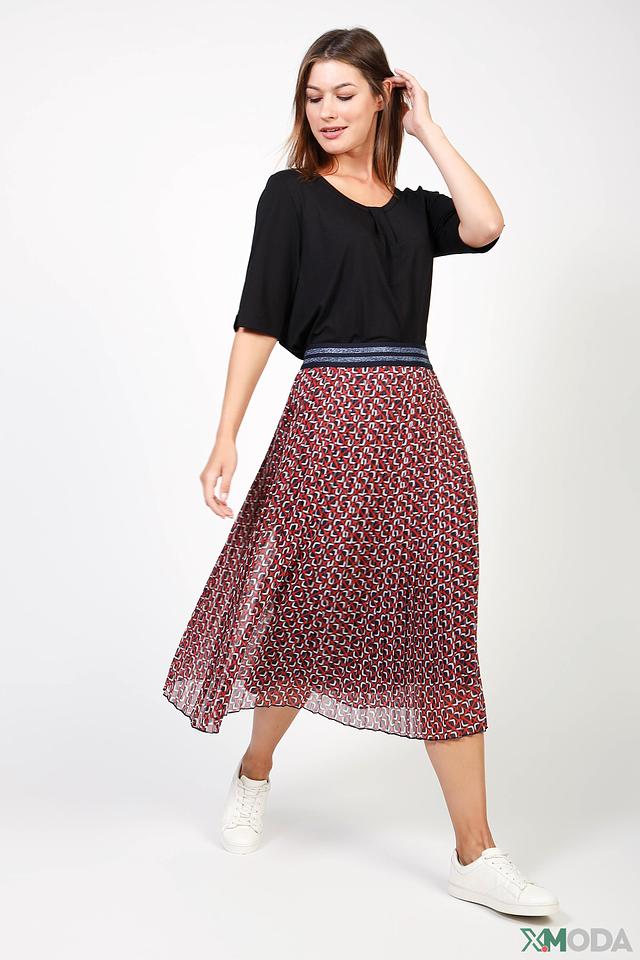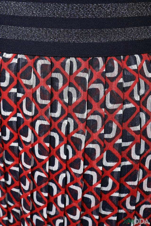 Юбка имеет длину миди и полуприлегающий силуэт. Принт, состоящий из геометрических фигур в красных, белых и синих тонах, придает изделию оригинальность и динамичность. Эластичный пояс на талии обеспечивает комфортную посадку и подчеркивает фигуру.