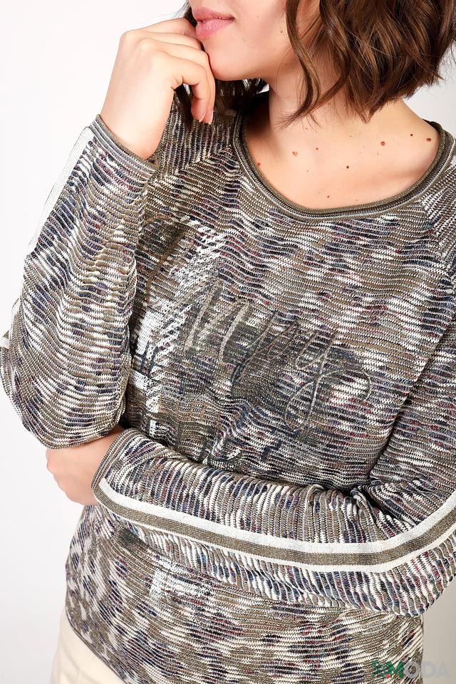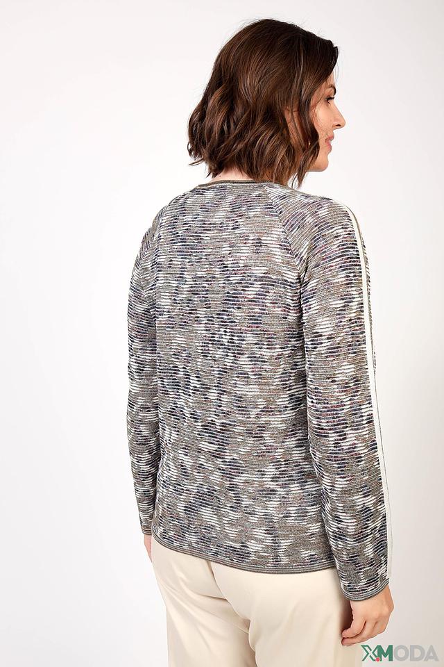 Пуловер имеет серый цвет с оригинальным рисунком, напоминающим тонкие вертикальные полоски. Декоративные полосы по бокам добавляют изысканности и подчеркивают стиль изделия. Круглый вырез горловины и длинные рукава делают его универсальным для различных образов.