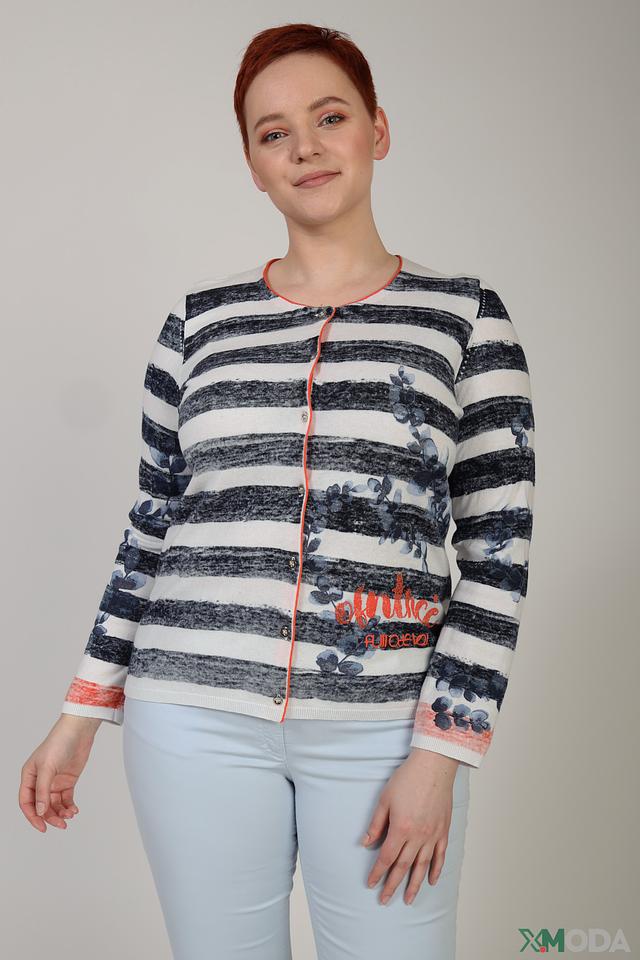 Этот жакет от Rabe collection выполнен в оригинальном дизайне, сочетающем полосатый рисунок и цветочный принт. Преобладающий цвет – синий, дополненный белыми полосами и нежными цветочными мотивами.