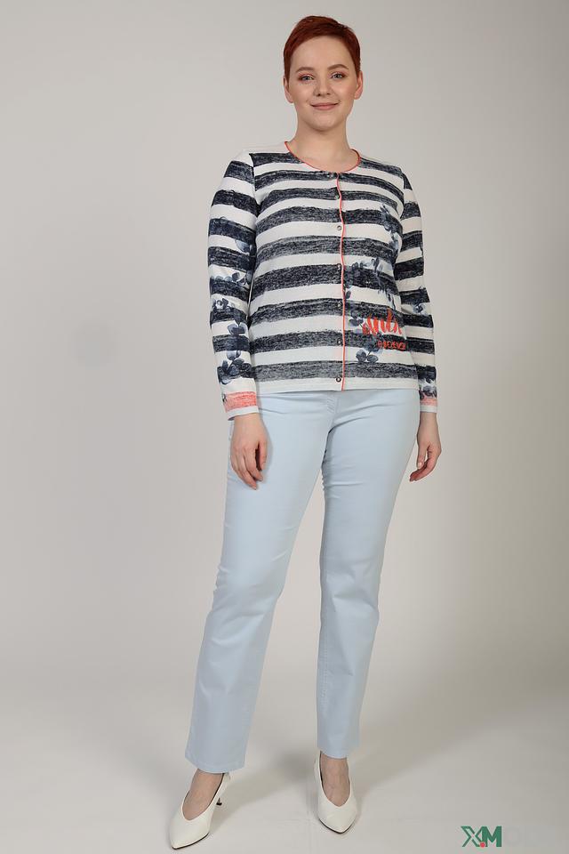 Жакет Rabe collection синего цвета с полосатым принтом и цветочным декором станет стильным дополнением к вашему гардеробу. Модель застегивается на пуговицы и имеет ¾ рукава. Состав: хлопок 100%