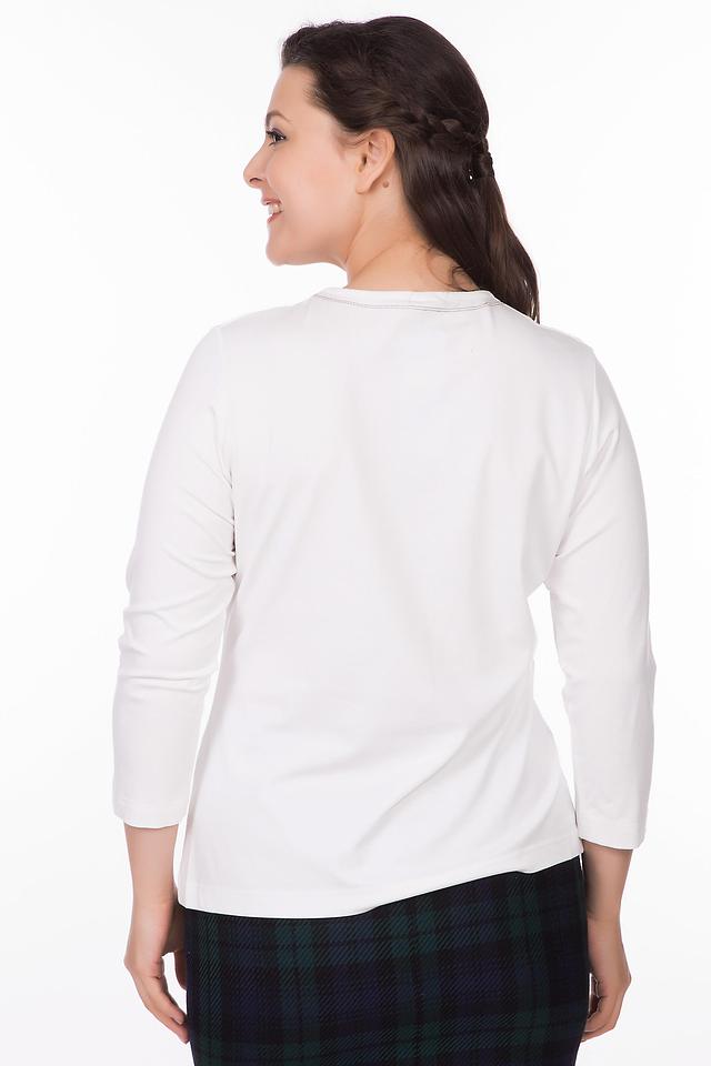 Модель имеет прямой крой, который обеспечивает комфортную посадку по фигуре. Рукав 3/4 и округлый вырез горловины придают блузе классический вид.
