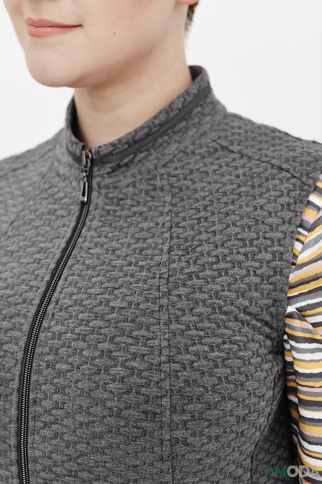Жилет имеет фактурную поверхность с геометрическим рисунком, который придает ему оригинальность. Застежка-молния позволяет регулировать степень прилегания. Модель имеет стандартную длину и силуэт, подходящий для различных типов фигур.