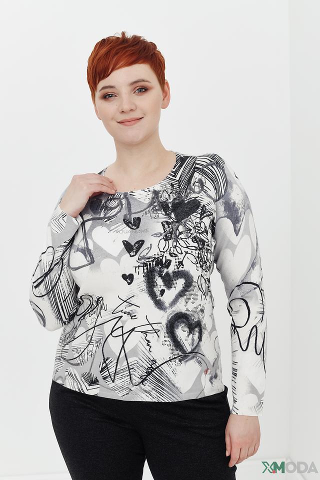Пуловер имеет свободный крой, который не сковывает движений и позволяет создать расслабленный силуэт. Округлый вырез горловины и длинные рукава делают его универсальным для различных погодных условий. Основной цвет пуловера – светло-серый, а главным акцентом является яркий и необычный принт, состоящий из абстрактных рисунков, сердечек и надписей.