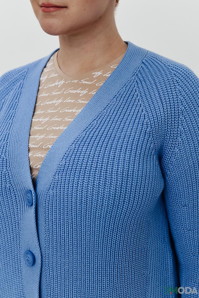 Кардиган застегивается на ряд пуговиц в тон изделия. Рукава – длинные. Вязаный узор с повторяющимися надписями придает кардигану оригинальность и стиль.
