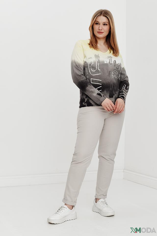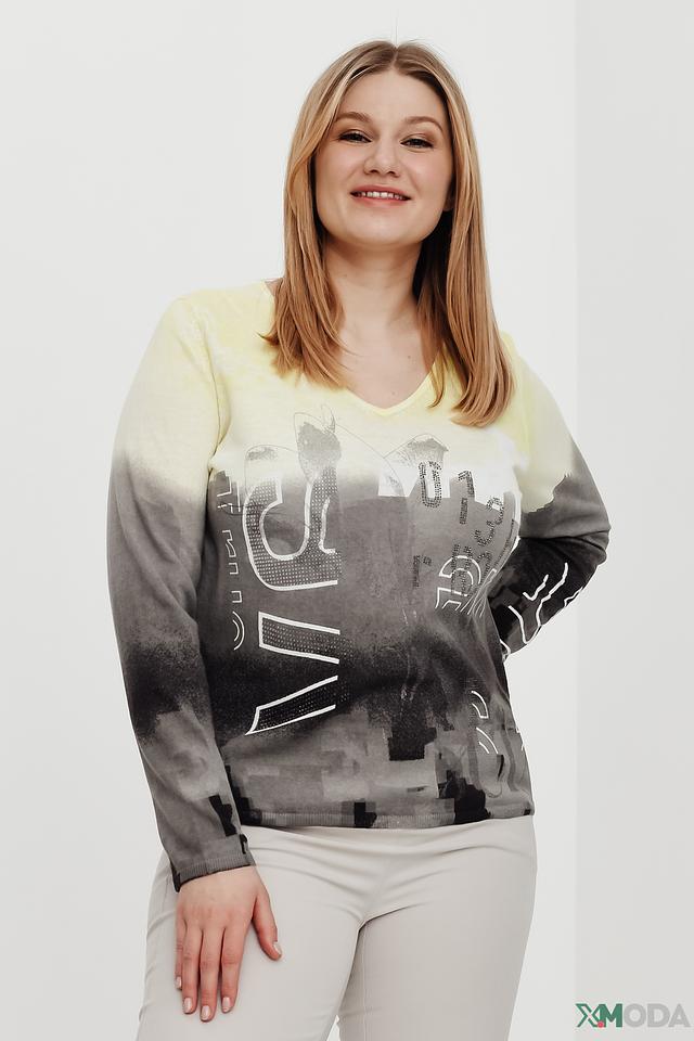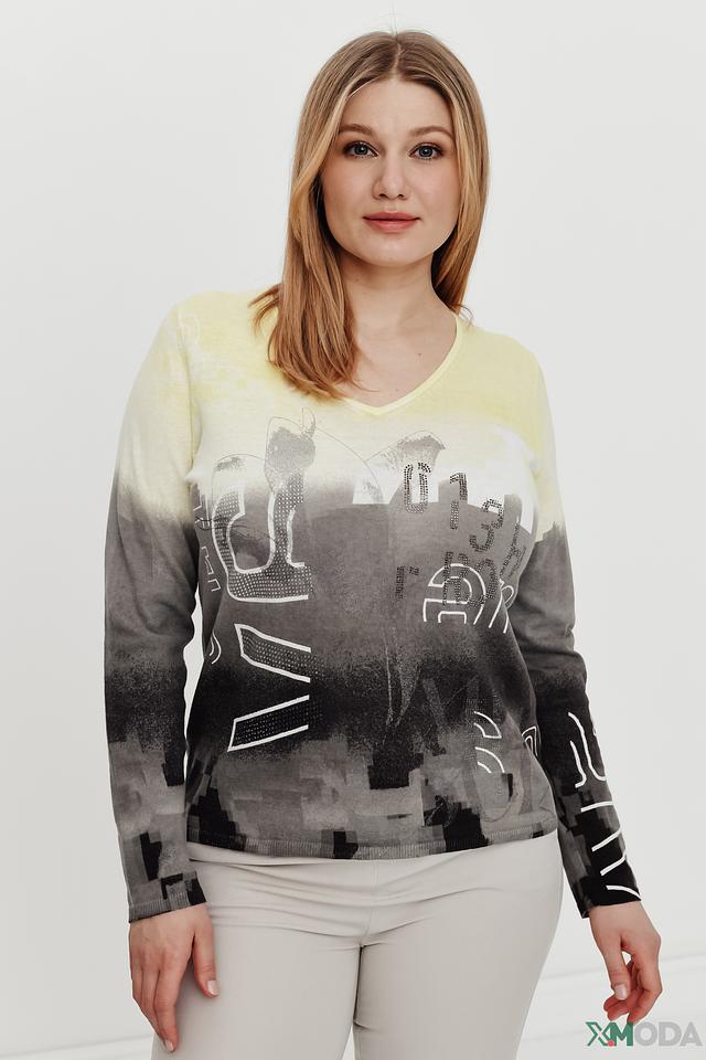 Пуловер имеет свободный крой и V-образный вырез горловины. Главная особенность модели – яркий принт, выполненный в технике градиента, сочетающий в себе светло-жёлтые, серые и чёрные оттенки. Принт изображает абстрактные фигуры, создавая современный и динамичный вид.