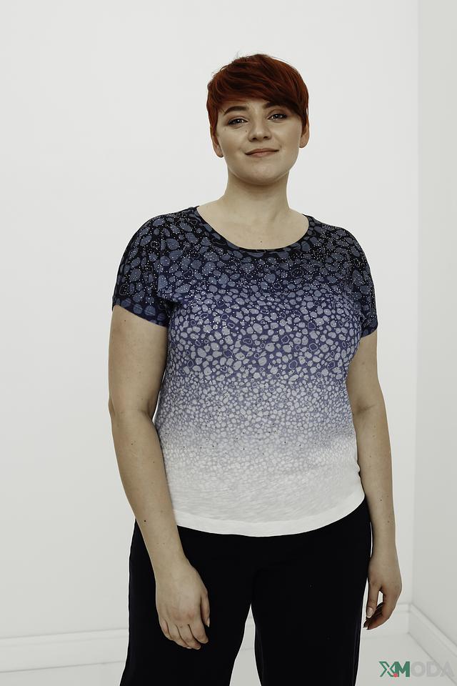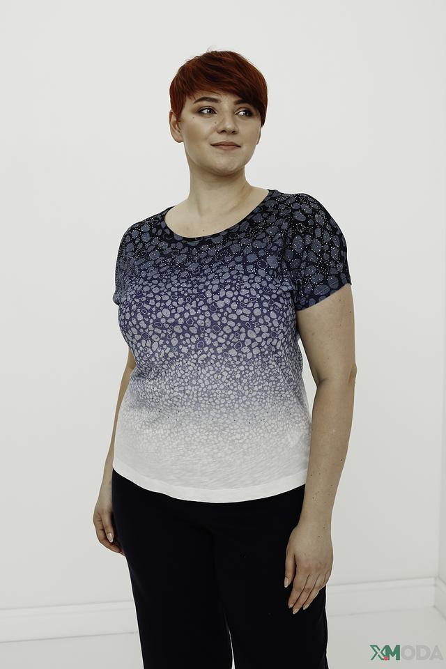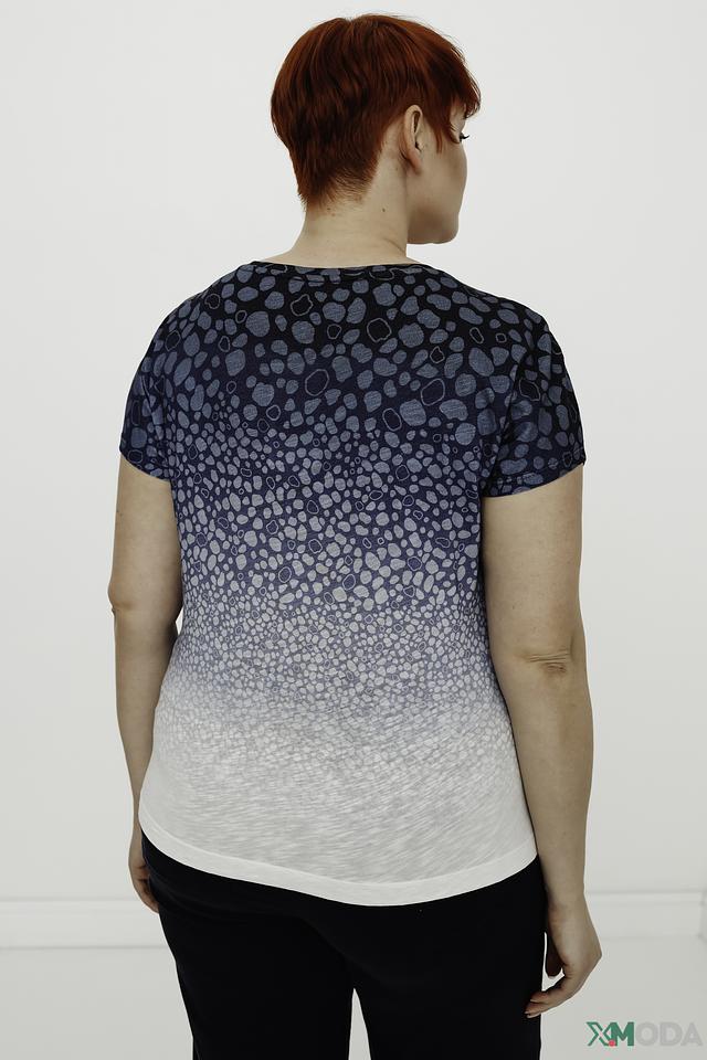 Блуза от Rabe collection голубого и белого цвета с оригинальным принтом в виде пятен. Модель выполнена из мягкого и приятного к телу сочетания хлопка и модала, обеспечивая комфорт в носке. Состав: хлопок 50%, модал 50%