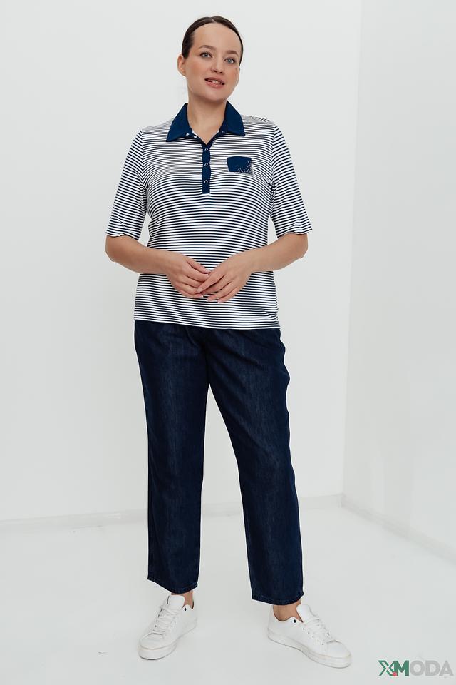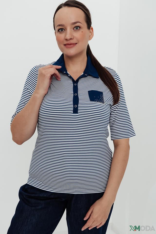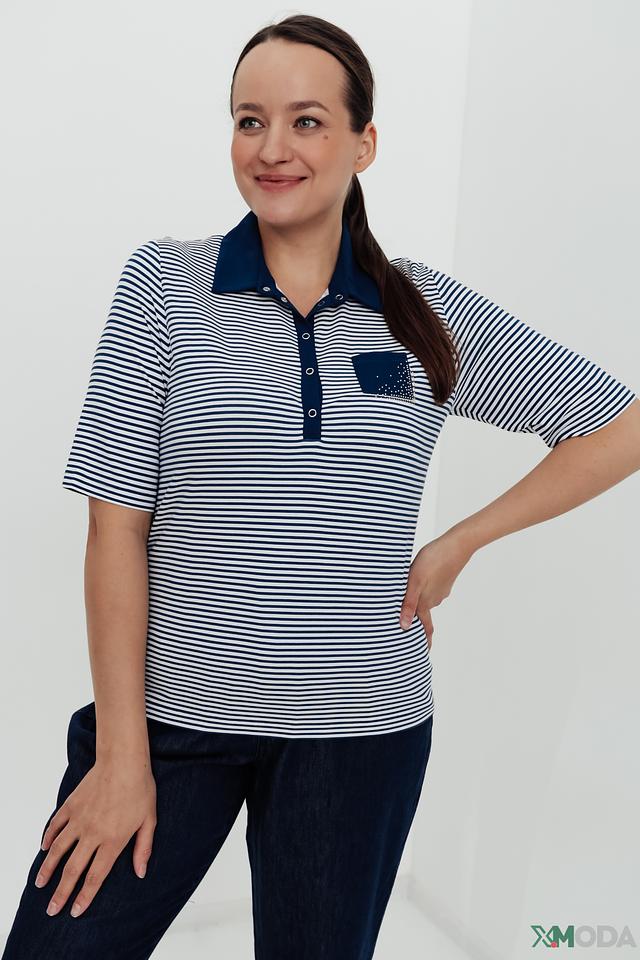 Женское поло Rabe collection сине-белого цвета с коротким рукавом и декоративным карманом. Модель выполнена в классическом стиле с полоской и дополнена аккуратной застежкой на пуговицах. Состав: вискоза 96%, эластан 4%