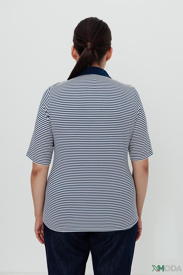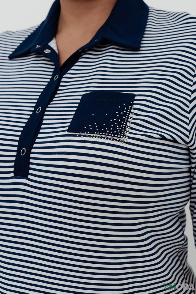 Поло имеет сине-белую полосатую расцветку, которая придает образу свежесть и легкость. На груди расположен накладной карман, украшенный небольшими декоративными элементами. Застежка выполнена на пуговицах в тон изделия.