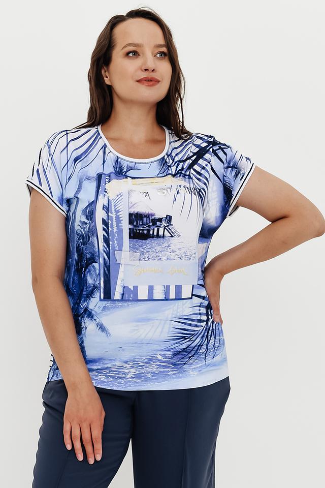 Эта стильная блуза от Rabe collection выполнена в голубой цветовой гамме и украшена эффектным тропическим принтом с изображением морского пейзажа и пальмовых листьев. Модель имеет свободный крой, короткие рукава и круглый вырез горловины.