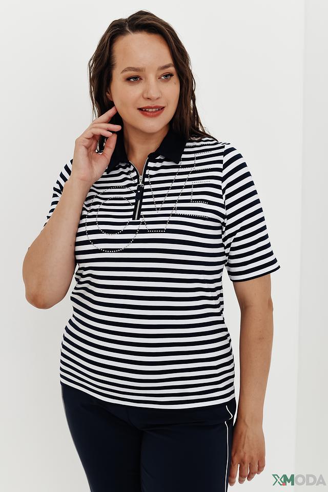 Поло имеет оригинальный дизайн: чёрно-белая полоска и молния в верхней части изделия. Декоративная отделка в виде цепочек добавляет изысканности.