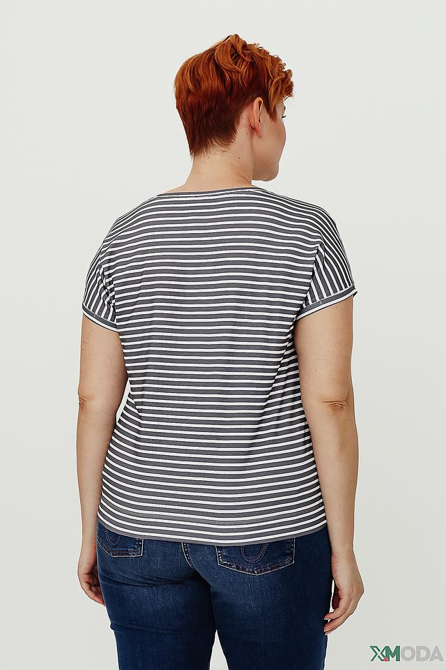 Футболка имеет свободный крой, короткий рукав и округлый вырез горловины. Главная особенность модели – яркий и стильный принт на передней части, выполненный в голубых и серых тонах. Задняя часть футболки выполнена в горизонтальную полоску.