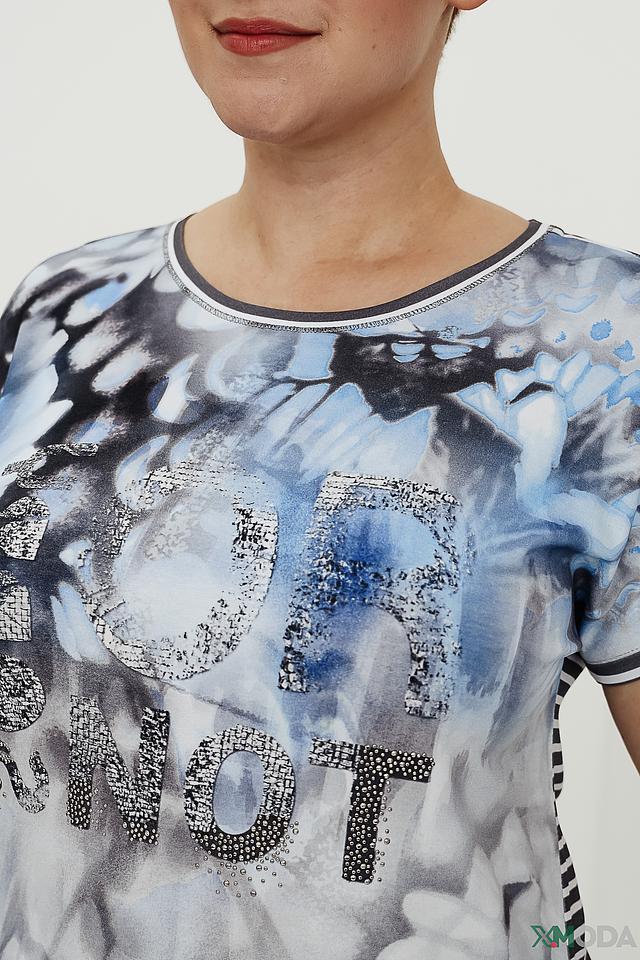 Женская футболка Rabe collection голубого цвета с оригинальным принтом и коротким рукавом. Изготовлена из мягкой вискозы с добавлением эластана для комфорта и свободы движений. Стильный и удобный вариант для повседневного образа. Состав: вискоза 92%, эластан 8%