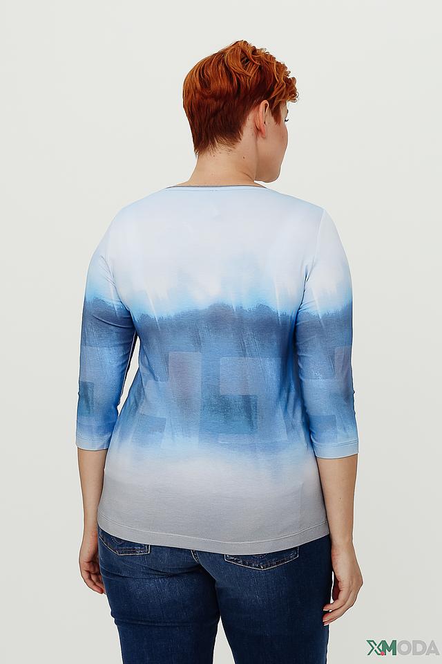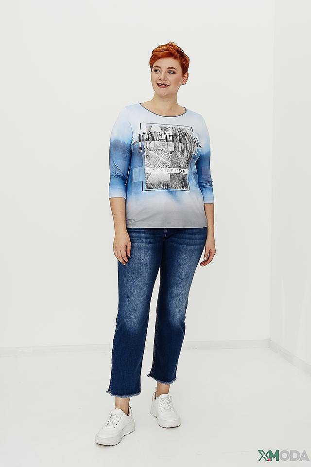 Лонгслив имеет голубой цвет с ярким принтом, изображающим городской пейзаж. Принт выполнен в технике акварели, что придает ему легкость и оригинальность. Вырез горловины округлый, рукава – три четверти.