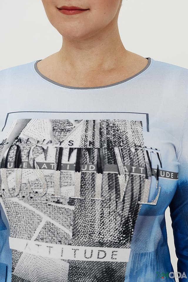Женский лонгслив Rabe collection голубого цвета с оригинальным принтом в виде городского пейзажа. Изготовлен из мягкой вискозы с добавлением эластана для комфорта и хорошей посадки. Идеально дополнит повседневный образ. Состав: вискоза 92%, эластан 8%