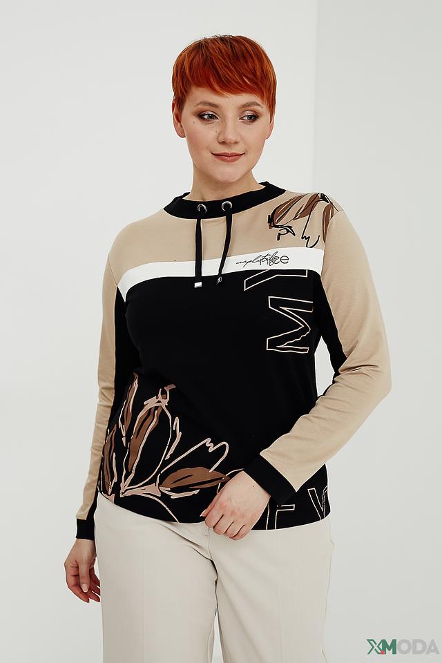 Чёрный пуловер от Rabe collection с оригинальным принтом и бежевой отделкой. Модель выполнена из мягкого и приятного к телу сочетания хлопка, модала и эластана, обеспечивающего комфорт при носке. Состав: хлопок 48%, модал 48%, эластан 4%