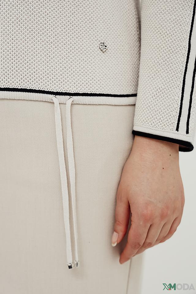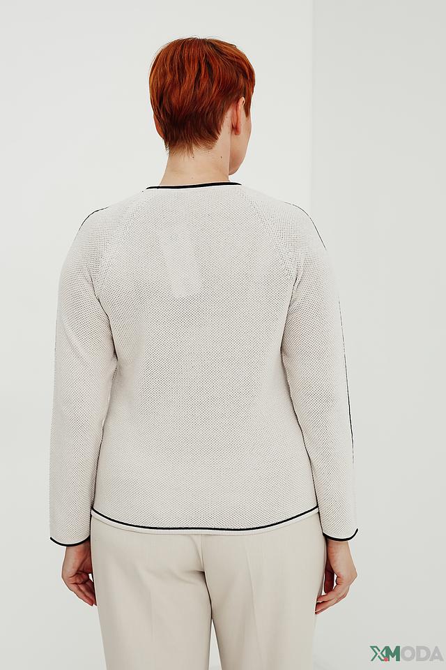 Модель имеет классический крой с круглым вырезом горловины и длинными рукавами. Отделка горловины, манжеты и нижний край выполнены в тонкую чёрную полоску, что добавляет изделию изысканности.