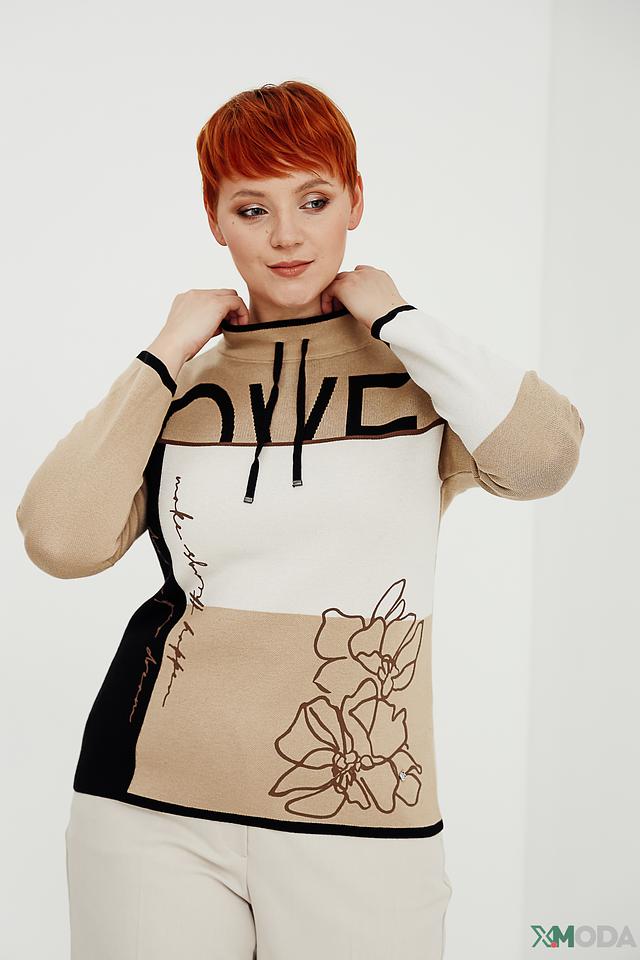 Пуловер имеет оригинальный дизайн с изображением надписи и цветочным мотивом, выполненными в чёрно-белой гамме. Контрастные чёрные полосы на рукавах и по низу изделия подчеркивают его современный вид.