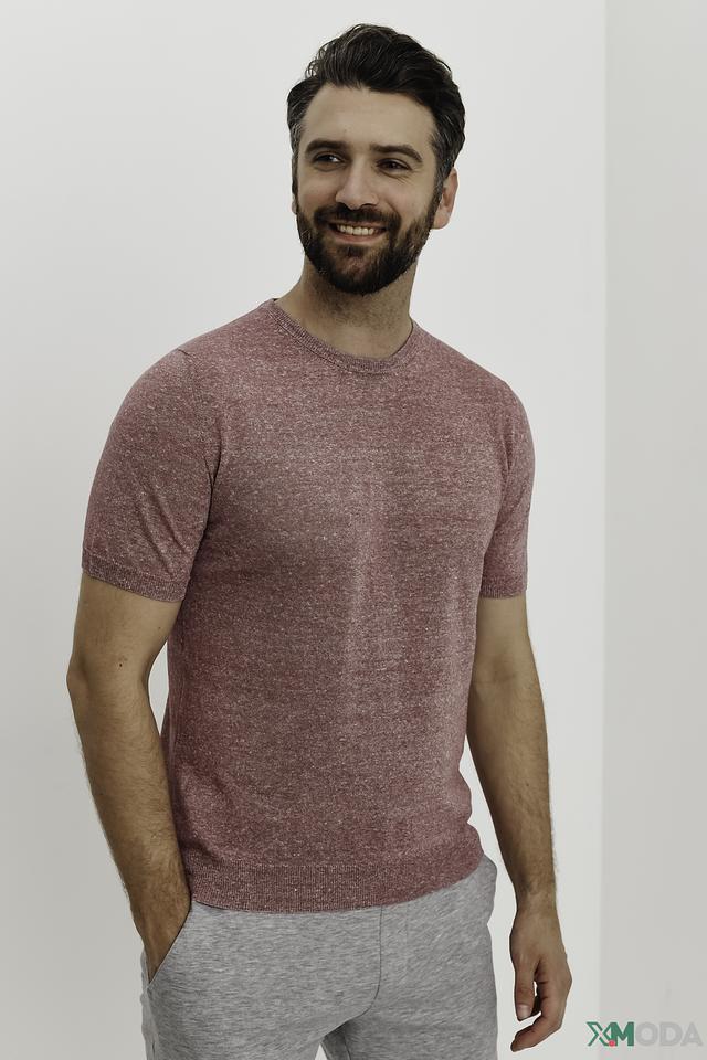 Модель имеет классический крой с круглым вырезом горловины и короткими рукавами. Терракотовый цвет придает футболке особый шарм и позволяет легко сочетать ее с различными элементами гардероба. Текстура ткани с небольшим эффектом меланжа добавляет изделию визуальный интерес.