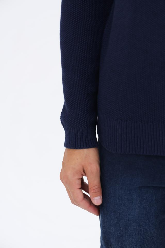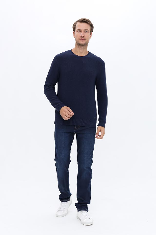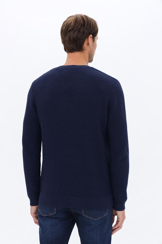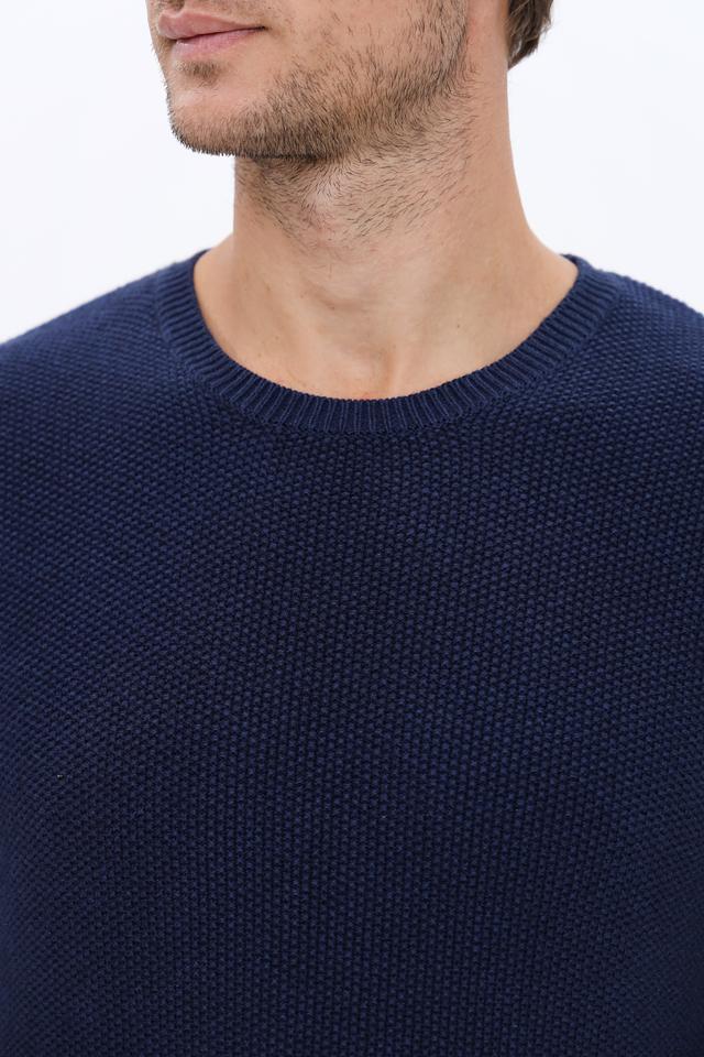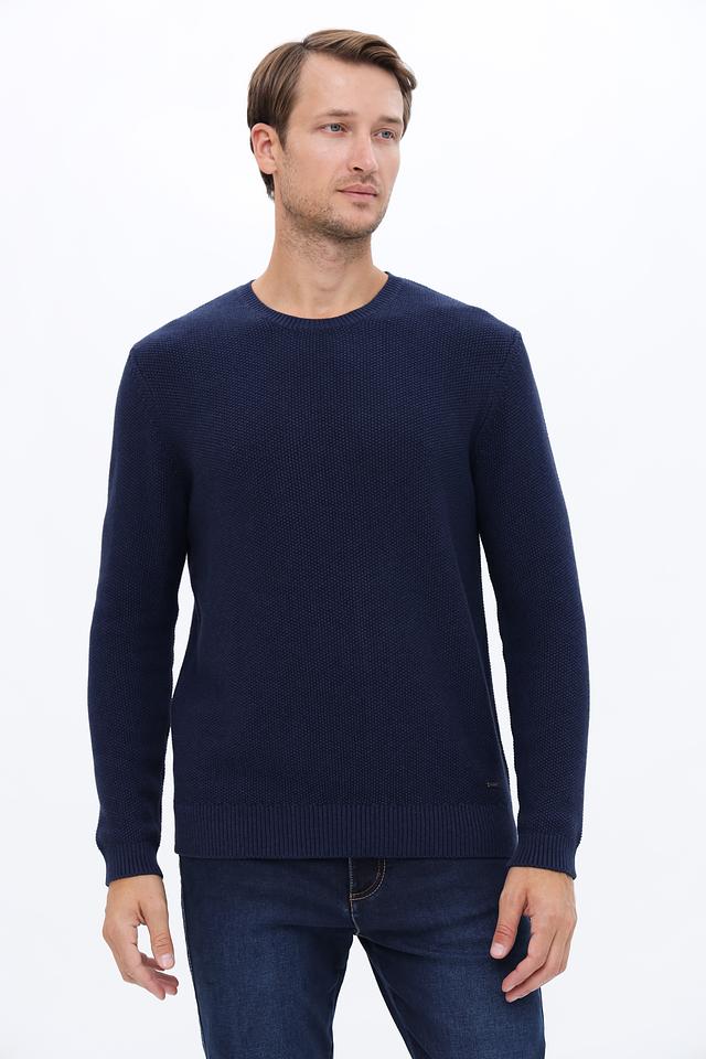 Джемпер имеет классический крой с круглым вырезом горловины и длинными рукавами. Текстурная вязка придает изделию объём и визуальный интерес. Тёмно-синий цвет делает его универсальным и легко сочетаемым с различными элементами гардероба.