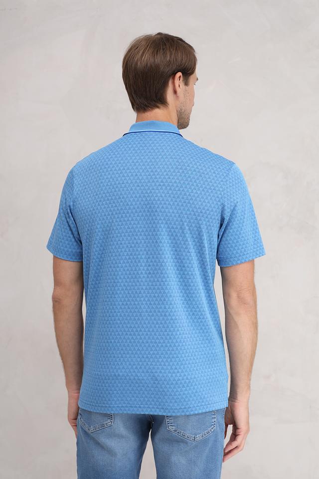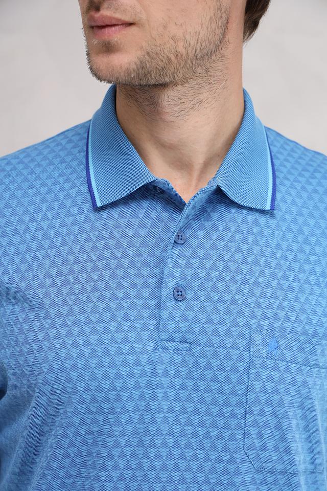 Данная модель выполнена в приятном голубом цвете и украшена геометрическим узором, который придает ей оригинальность. Классический крой поло обеспечивает свободу движений, а воротник и планка с пуговицами выполнены в контрастном цвете – светло-голубом, что добавляет акцент.