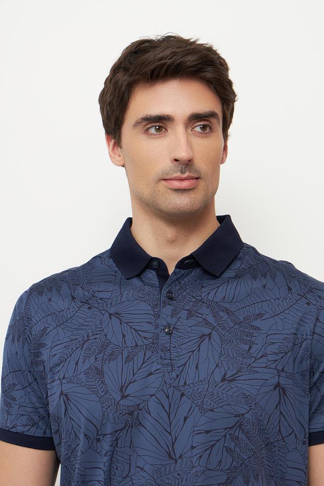 Основной цвет поло – тёмно-синий, который служит идеальным фоном для яркого и красочного тропического принта, изображающего листья. Воротник и манжеты выполнены в тёмно-синем цвете с контрастной цветной полосой, добавляющей динамичности образу.