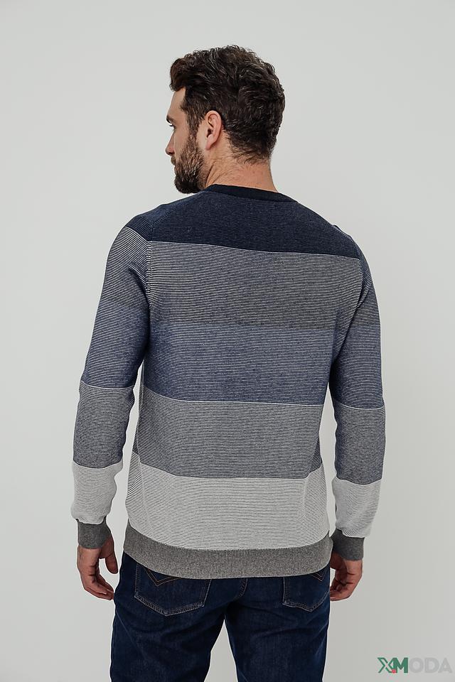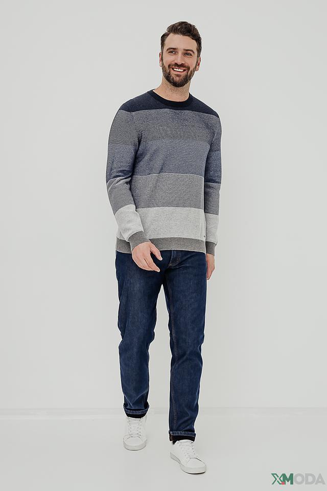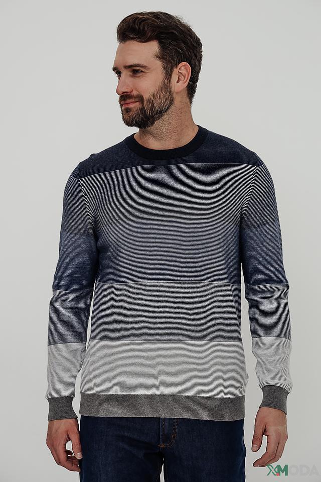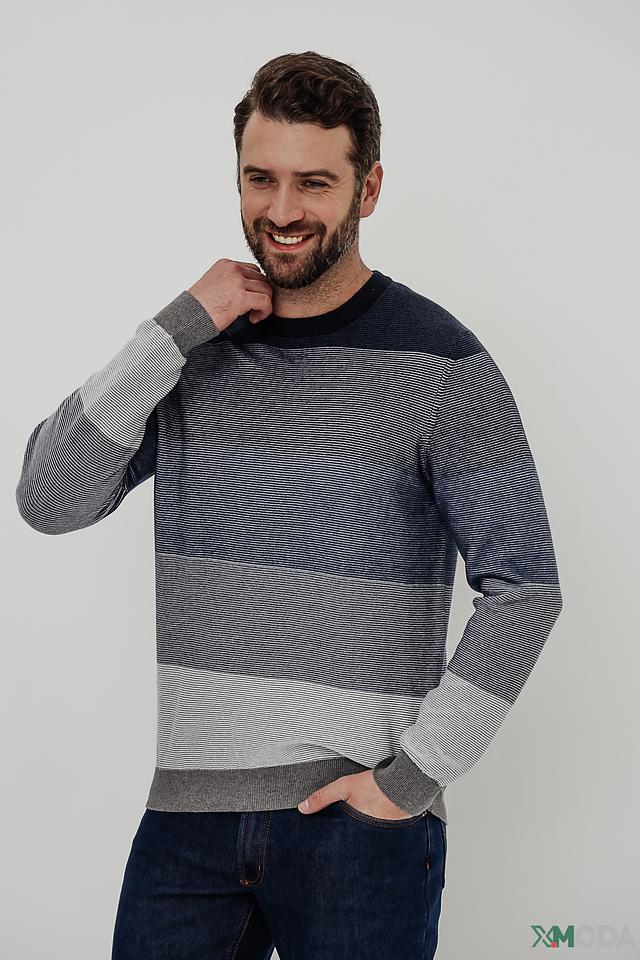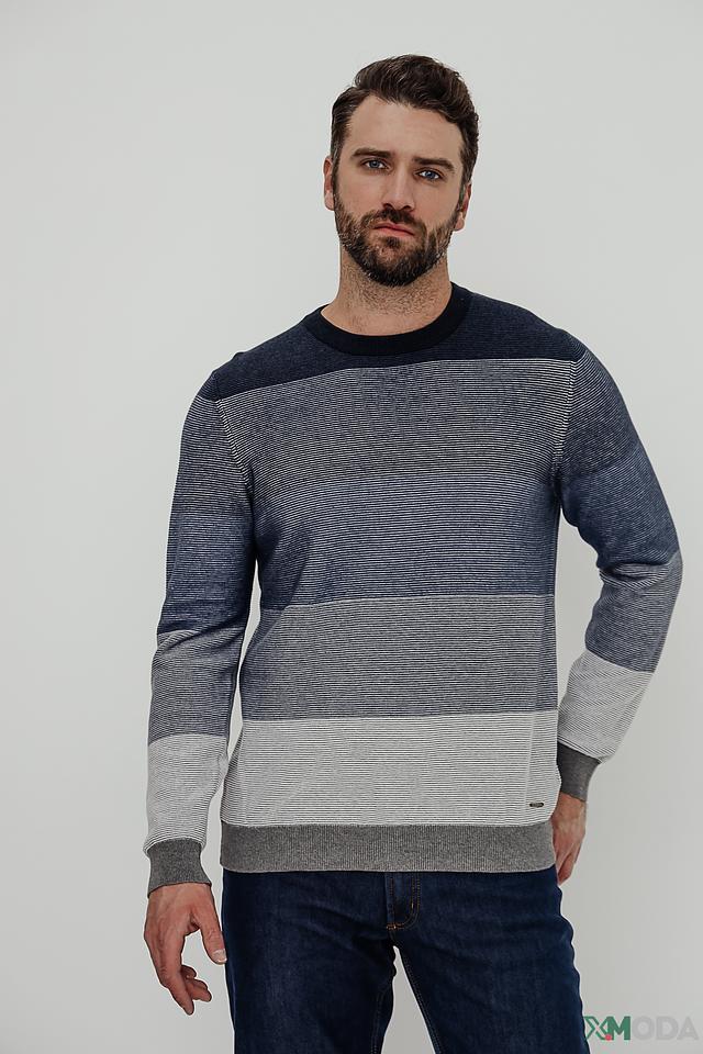 Этот мужской джемпер от Ragman выполнен в серой цветовой гамме с оригинальным горизонтальным рисунком в виде полос разной ширины и оттенков. Модель имеет классический крой с круглым вырезом горловины и длинными рукавами.