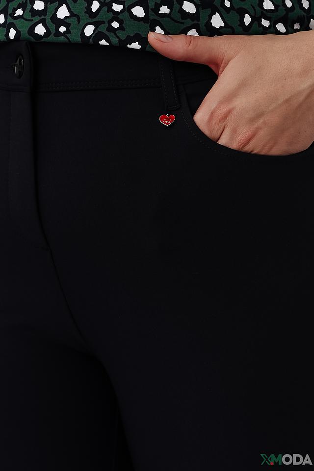 Модель имеет стандартную посадку, прямой крой и зауженные книзу штанины. На поясе расположена небольшая декоративная деталь в виде сердца. Брюки оснащены двумя задними карманами.