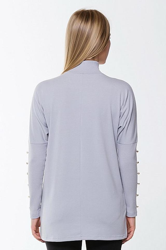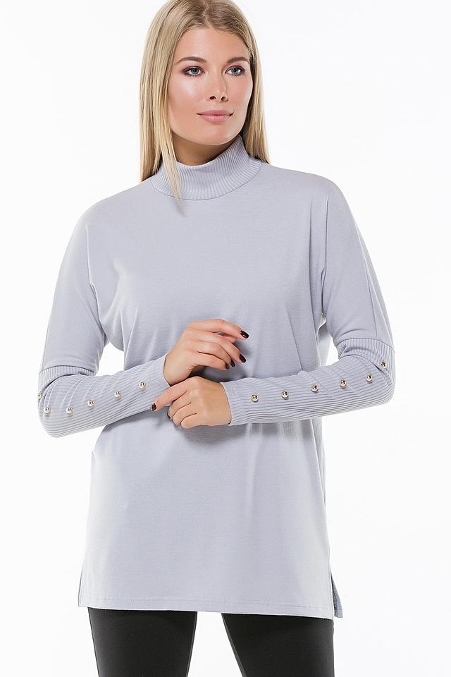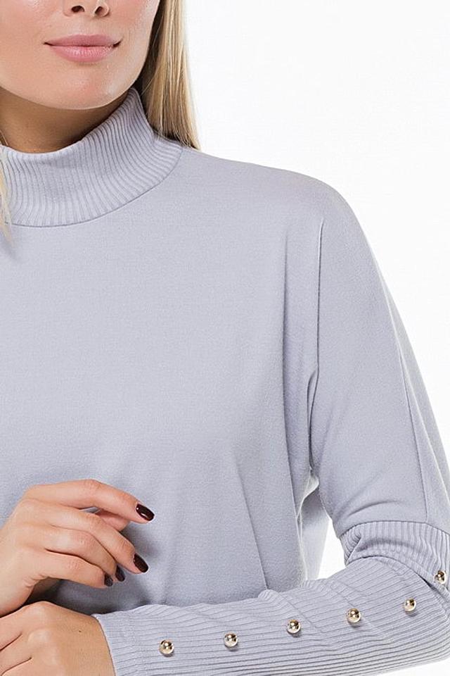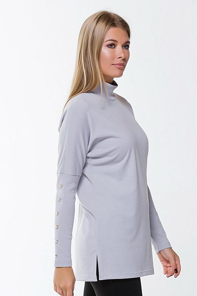Стильная блуза Remix серого цвета с рукавами, украшенными декоративными пуговицами, и высоким воротником-стойкой. Изготовлена из мягкой и приятной к телу ткани, обеспечивающей комфорт в носке. Состав: полиэстер 60%, вискоза 35%, эластан 5%